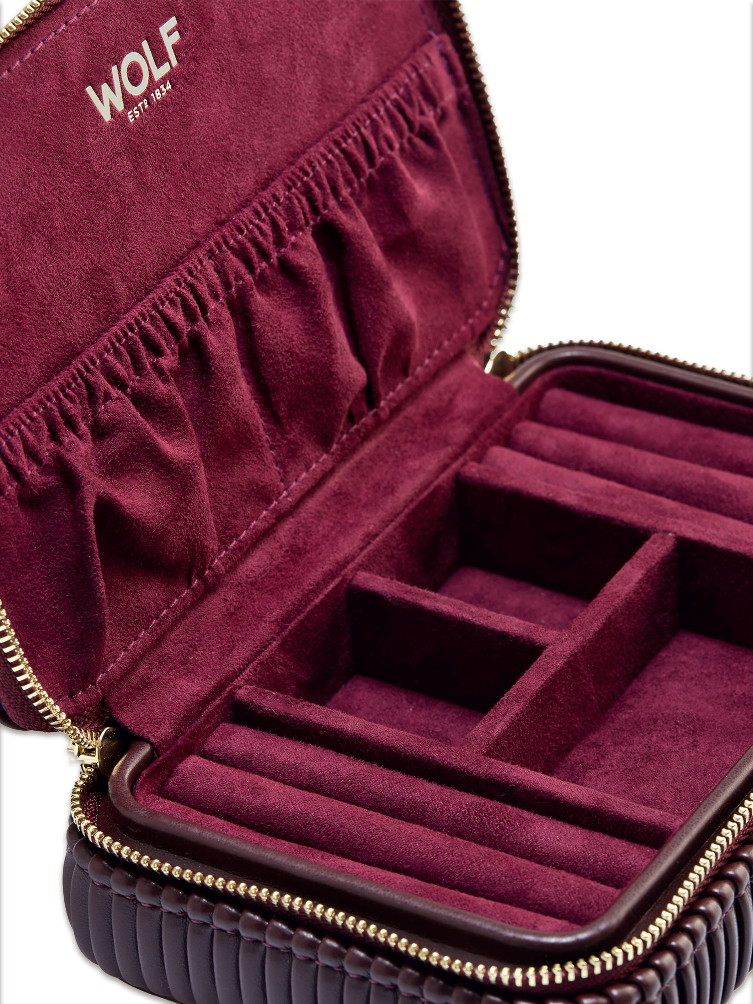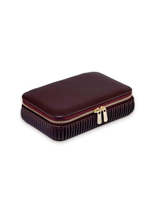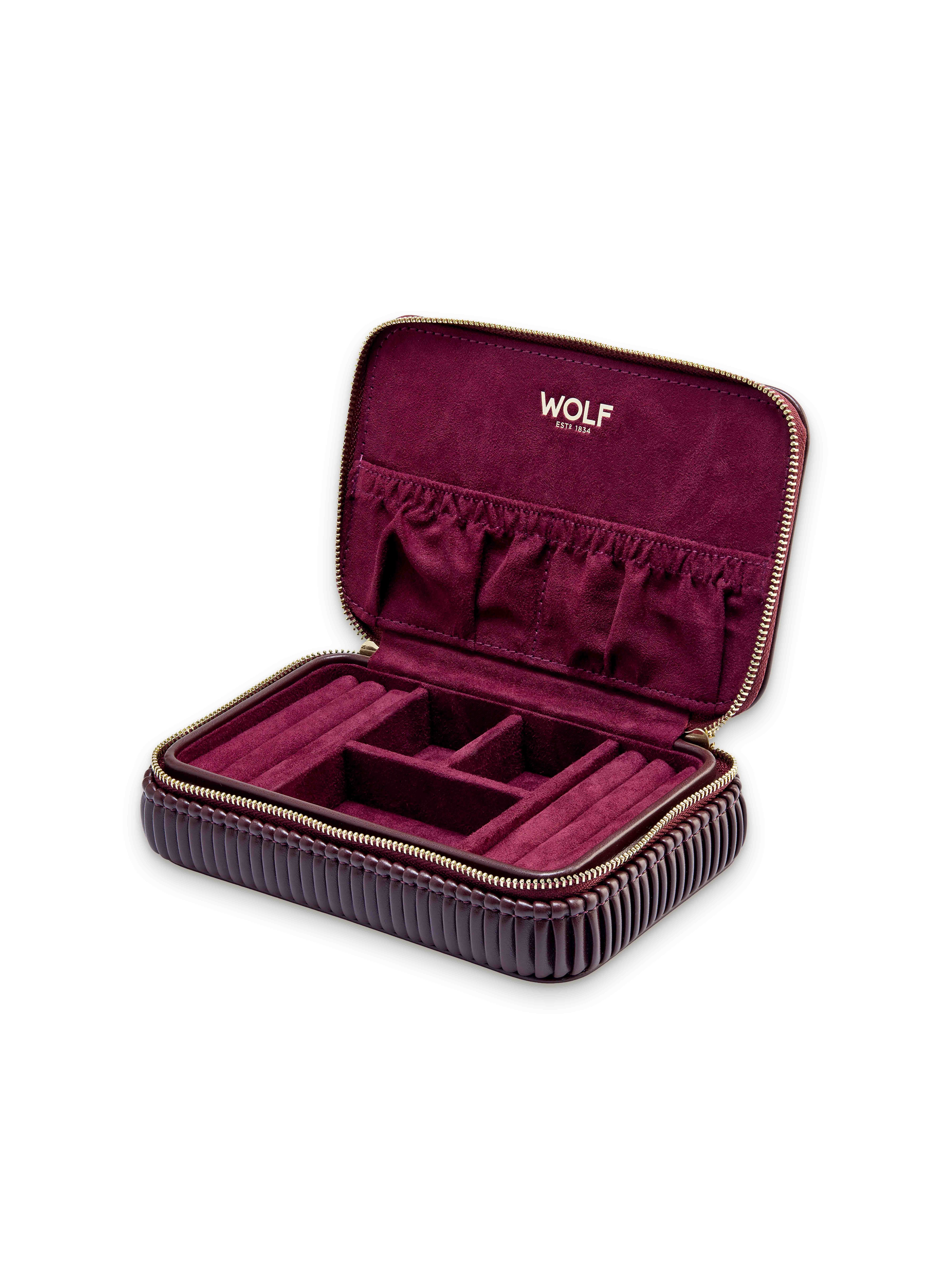 You won't want to travel without this jewelry box anymore. The Zip Case Bella by Wolf, made of burgundy vegan leather with dimensions of 16.5 x 10.2 x 4.4 centimeters, appears timeless and elegant with its smooth surface and folded sides. It is equipped with three compartments and two pockets for storing necklaces, bracelets, and pendants, and additionally offers several padded rolls for rings and earrings. The use of LusterLoc™ fabric inside the case prevents your favorite pieces from tarnishing for up to 35 years. Sophisticated and practical – your ideal jewelry organizer for on the go.