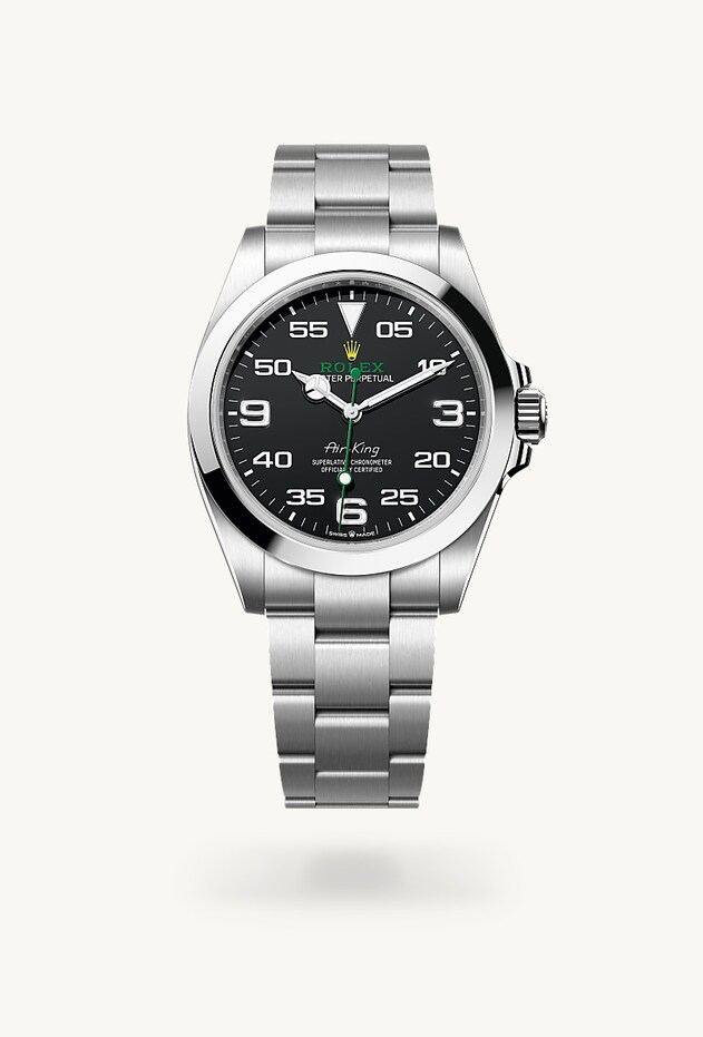 The Air-King dial features a distinctive black dial with a combination of large 3, 6 and 9 numerals marking the hours and a prominent minute scale for navigational time readings. It bears the name Air-King in the same lettering that was designed specially for the model in the 1950s.