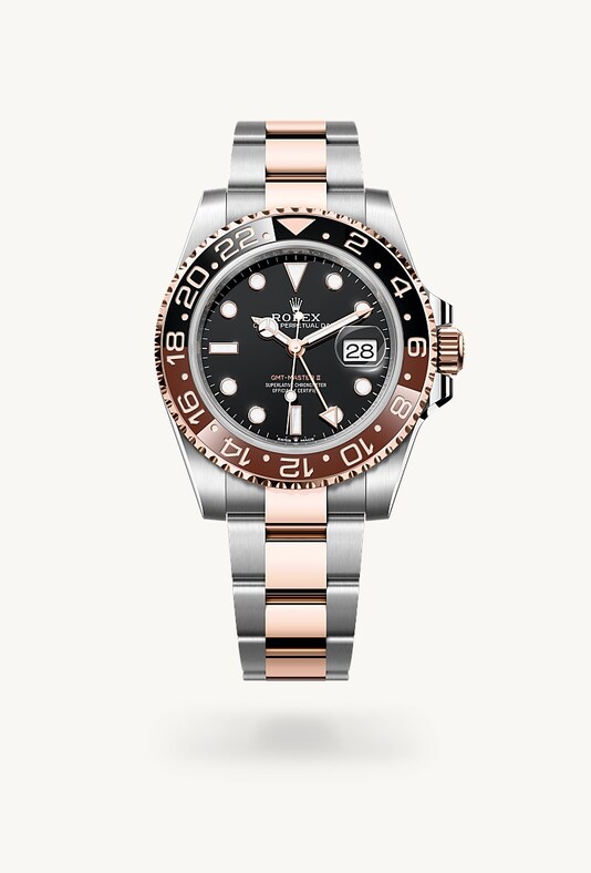 This model features a black dial and a two-colour Cerachrom bezel insert in brown and black ceramic. In addition to conventional hour, minute and seconds hands, the GMT-Master II features an arrow-tipped hand, which circles the dial once every 24 hours, as well as a bidirectional rotatable 24-hour graduated bezel. The distinctively coloured 24-hour hand displays the “home” reference time in a first time zone which can be read on the graduations on the bezel. The traveller’s local time is easily set by “jumping” from hour to hour, thanks to an ingenious mechanism operated via the winding crown: the hour hand can be adjusted forwards or backwards independently of the minute and seconds hands. This allows travellers to adapt to their new time zone without affecting the precision of their timekeeping.