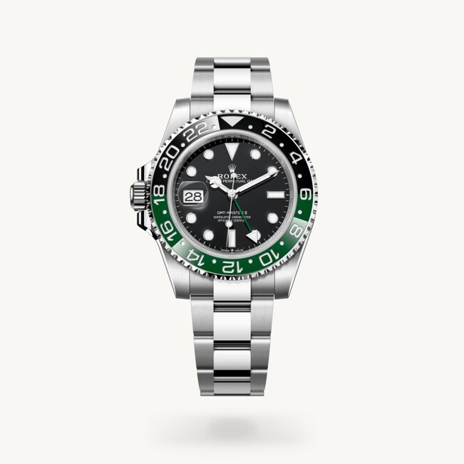 This model features a black dial and a two-colour Cerachrom bezel insert in green and black ceramic. In addition to conventional hour, minute and seconds hands, the GMT-Master II features an arrow-tipped hand, which circles the dial once every 24 hours, as well as a bidirectional rotatable 24-hour graduated bezel. The distinctively coloured 24-hour hand displays the “home” reference time in a first time zone which can be read on the graduations on the bezel. The traveller’s local time is easily set by “jumping” from hour to hour, thanks to an ingenious mechanism operated via the winding crown: the hour hand can be adjusted forwards or backwards independently of the minute and seconds hands. This allows travellers to adapt to their new time zone without affecting the precision of their timekeeping. The Cerachrom bezel insert features an original colour combination: black and an exclusive green that is reserved for this model.