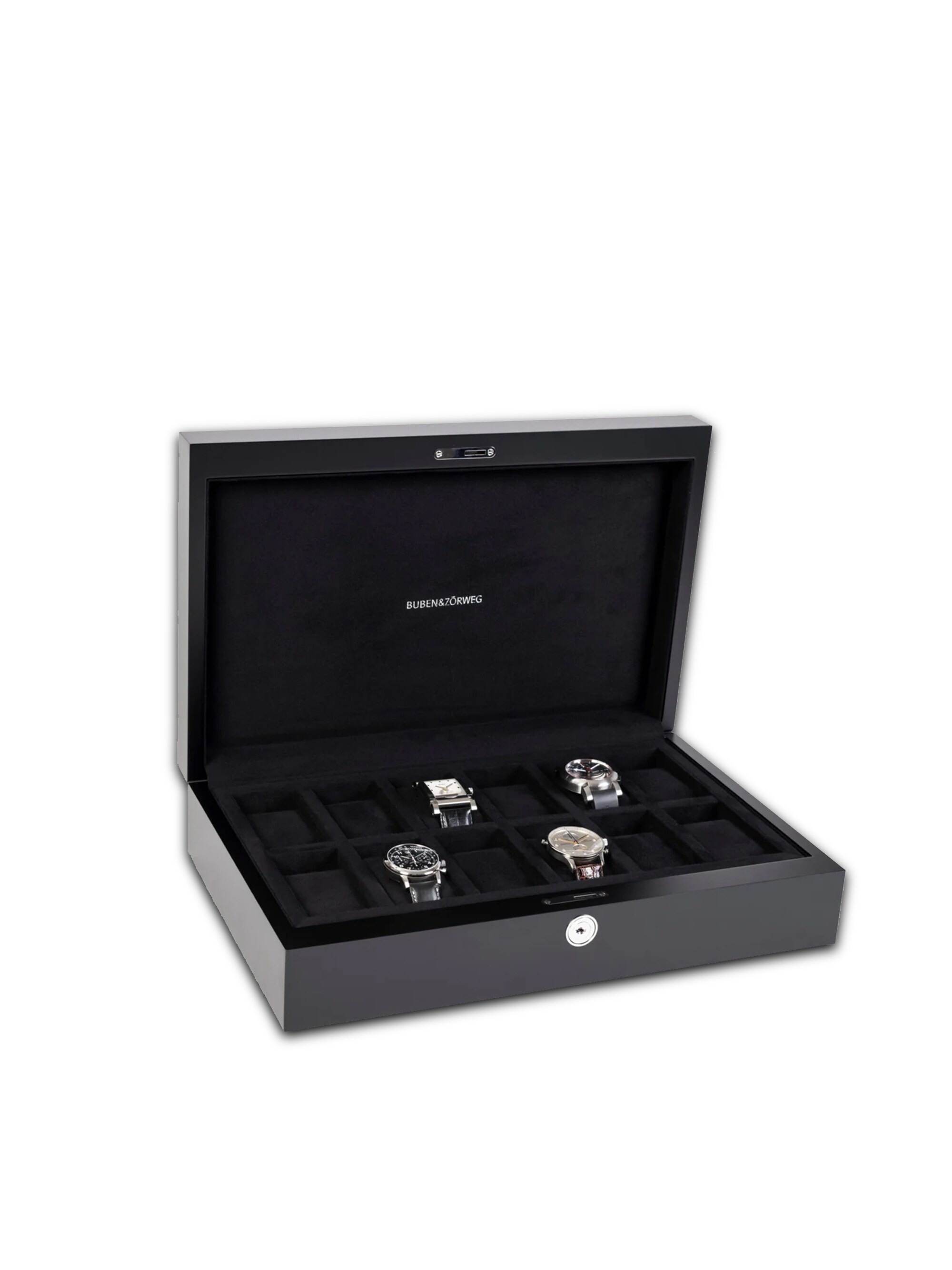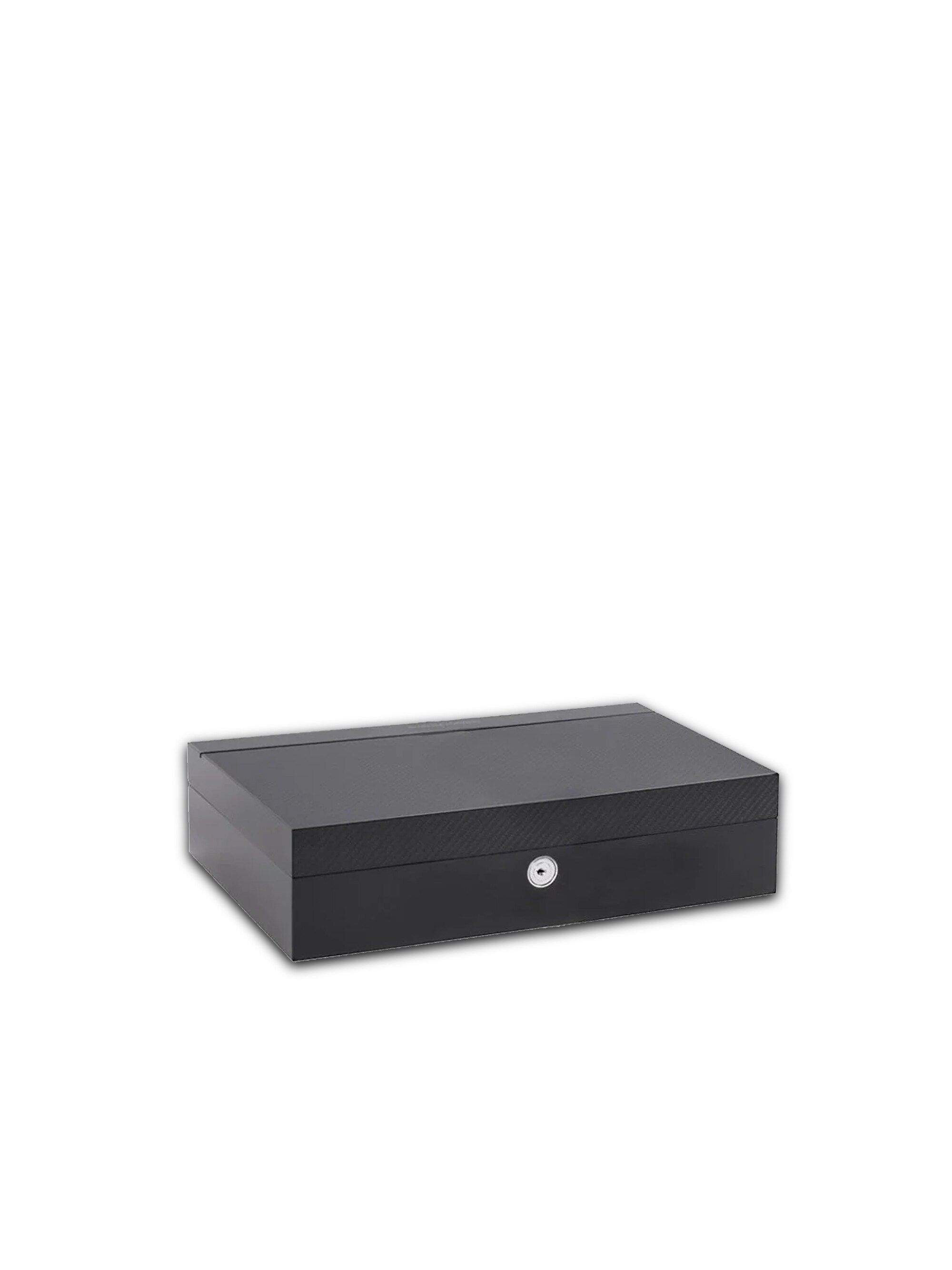 The Neo 12 Case Matte Carbon (Ref. 112000034) watch storage solution impresses with its clean lines, contemporary design, and uncompromising craftsmanship. Measuring 216 x 375 mm, the elegant wooden case is finished in striking matte carbon, combining technical precision with timeless sophistication. Inside, the Neo 12 Case offers a stylish and secure storage space for your valuable timepieces, creating the perfect setting for discerning collectors. Premium materials, perfectly balanced proportions, and the fusion of wood with a modern carbon look emphasize the exclusive character of this storage system for quartz-caliber watches. The Neo 12 Case Matte Carbon represents functional perfection and refined presentation at the highest level.