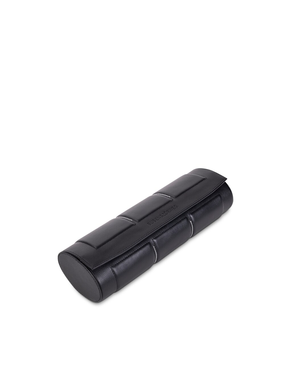 This hand-sewn watch roll from Buben & Zörweg (Ref. Nitro 3 Leather Black Silver 120041002) is an indispensable accessory for collectors and watch aficionados who consider themselves globetrotters. Durable and stylish at the same time, the box made of black leather and an interior of finest velour keeps your watches safe from dust and scratches. Silver-colored decorative stitching adds a lighter touch to the elegant design. The dimensions of 26 x 10 x 7.1 centimeters are compact as well as clear and can accommodate up to three timepieces at the same time. So you have the right watch at hand in an instant, whenever and wherever you need it.