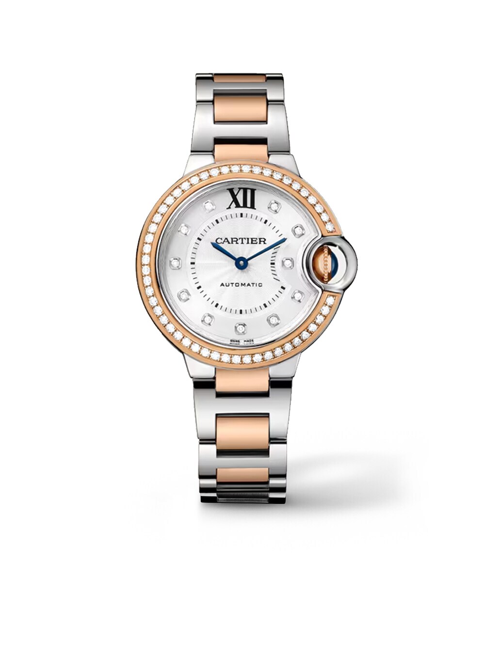 Ballon Bleu de Cartier watch, 33 mm, mechanical movement with automatic winding. Steel case, fluted rose gold 750/1000 crown set with a cabochon synthetic spinel. Rose gold 750/1000 bezel and silver guilloché dial, set with 61 brilliant-cut diamonds totaling 0.63 carat. Blued-steel sword-shaped hands. Sapphire crystal. Rose gold 750/1000 and steel interchangeable bracelet. Case thickness: 10.16 mm. Water-resistant up to 3 bar (approx. 30 meters/100 feet).