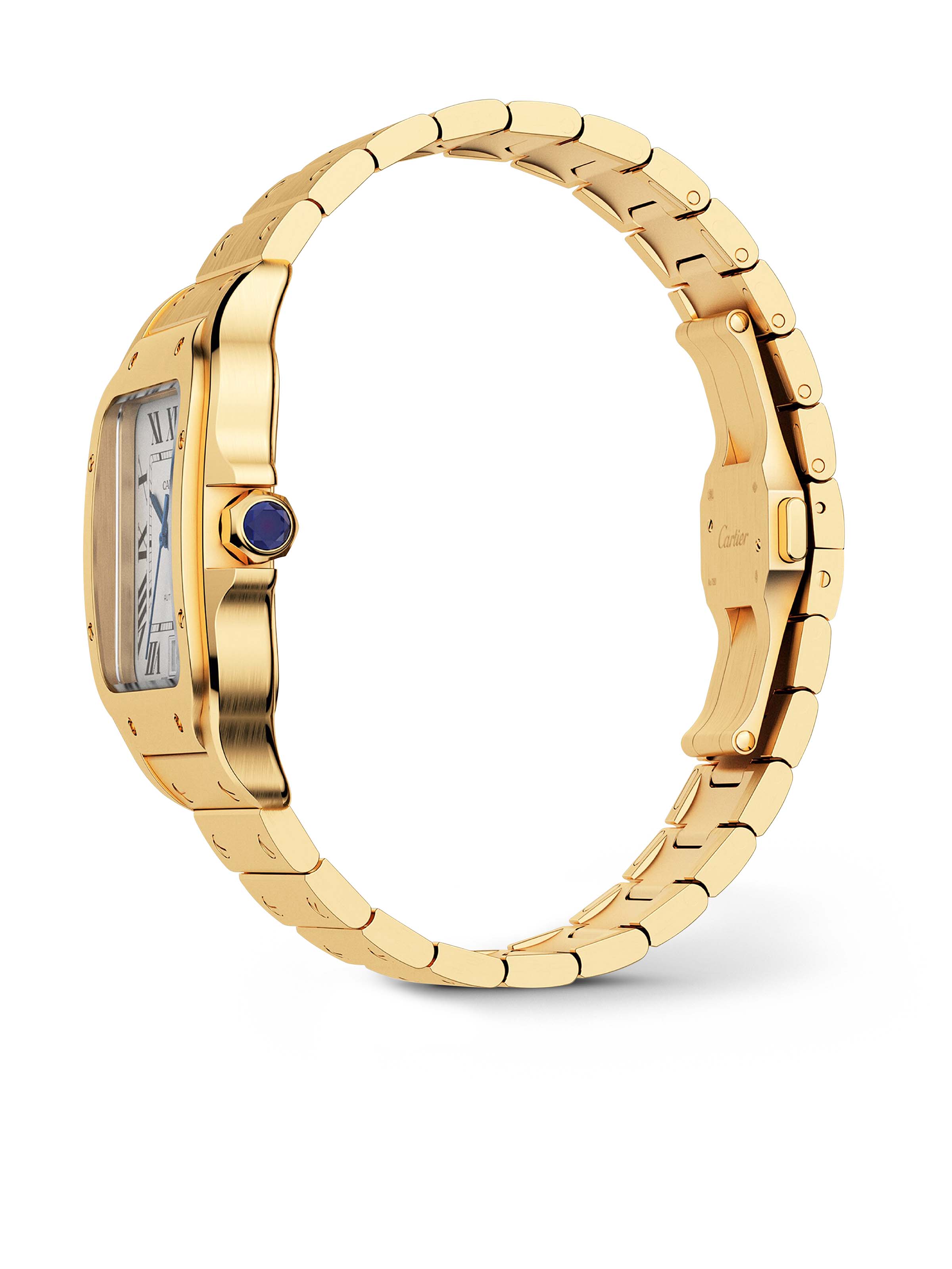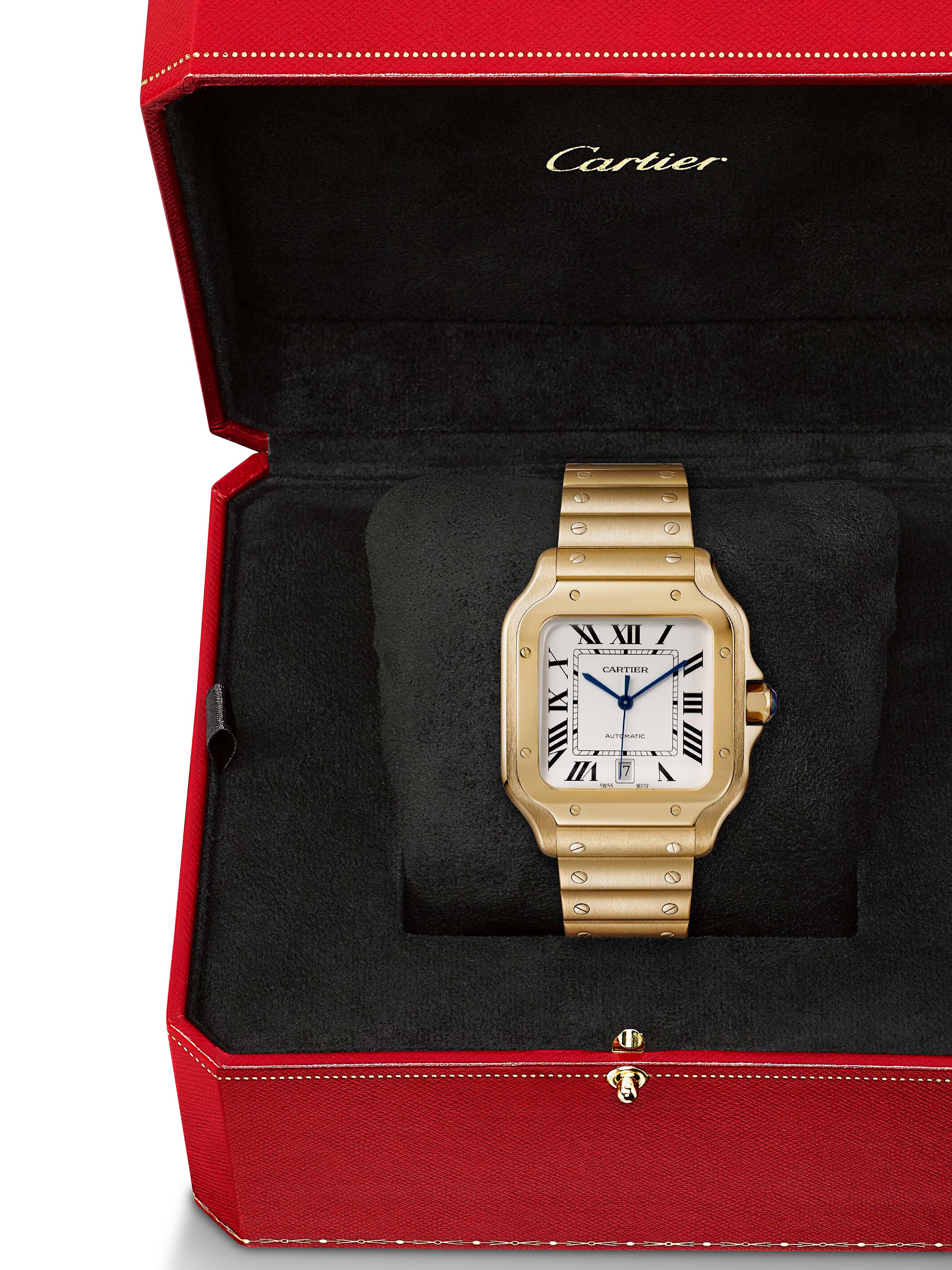 Santos watch, large model, mechanical movement with automatic winding, caliber 1847 MC. Yellow gold 750/1000 case, yellow gold 750/1000 7-sided crown set with a faceted sapphire, silvered opaline dial, blued-steel sword-shaped hands, sapphire crystal. Bracelet in yellow gold 750/1000 with “SmartLink” adjustment system. Second bracelet in alligator skin, with interchangeable yellow gold 750/1000 folding buckle. Both bracelets are fitted with the “QuickSwitch” interchangeability system. Case width: 39.8 mm, thickness: 9.38 mm. Water-resistant up to 10 bar (approx. 100 meters/100 feet).