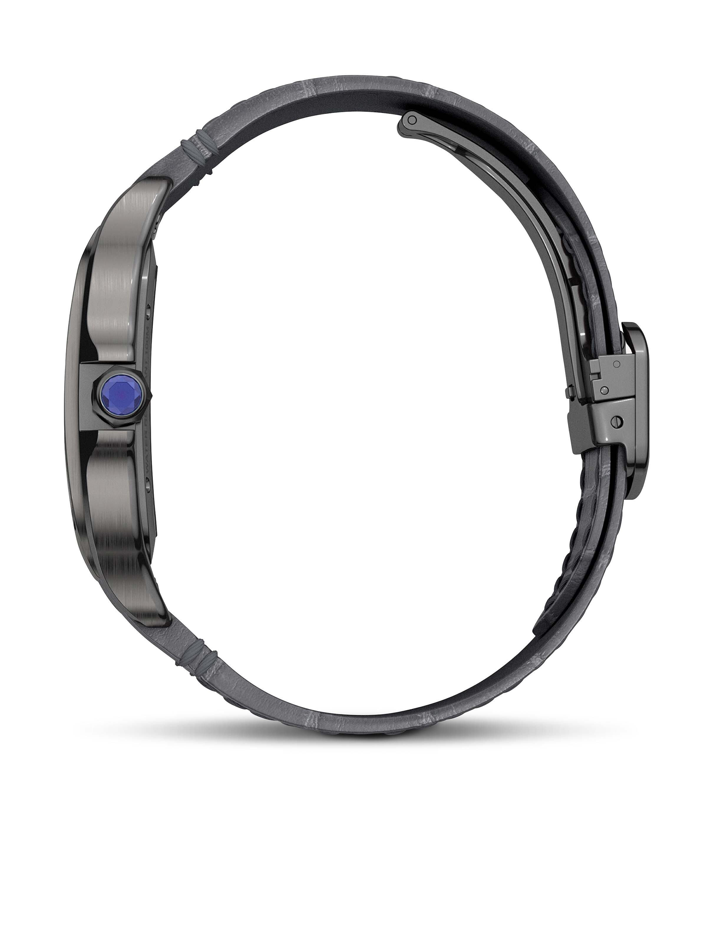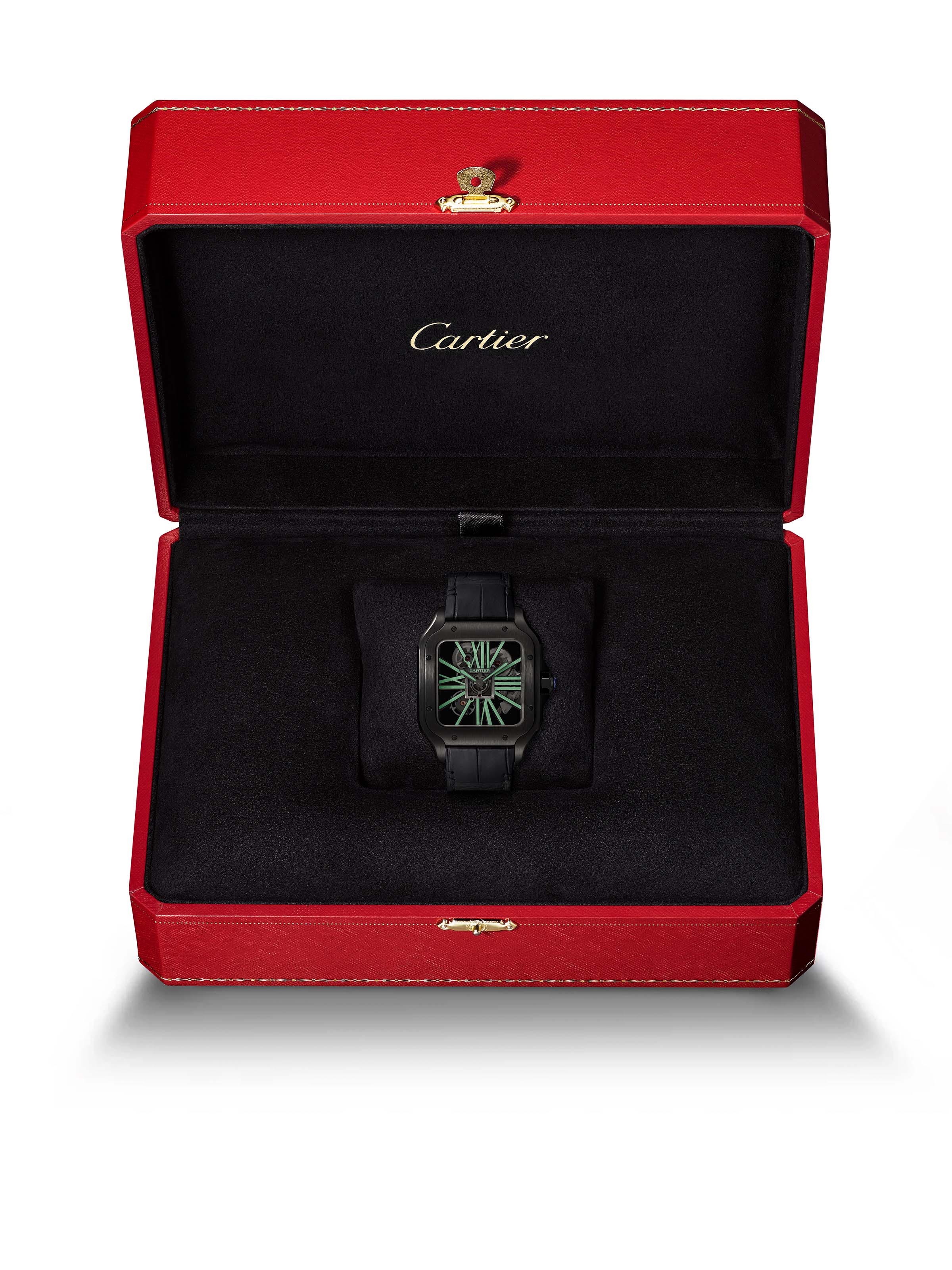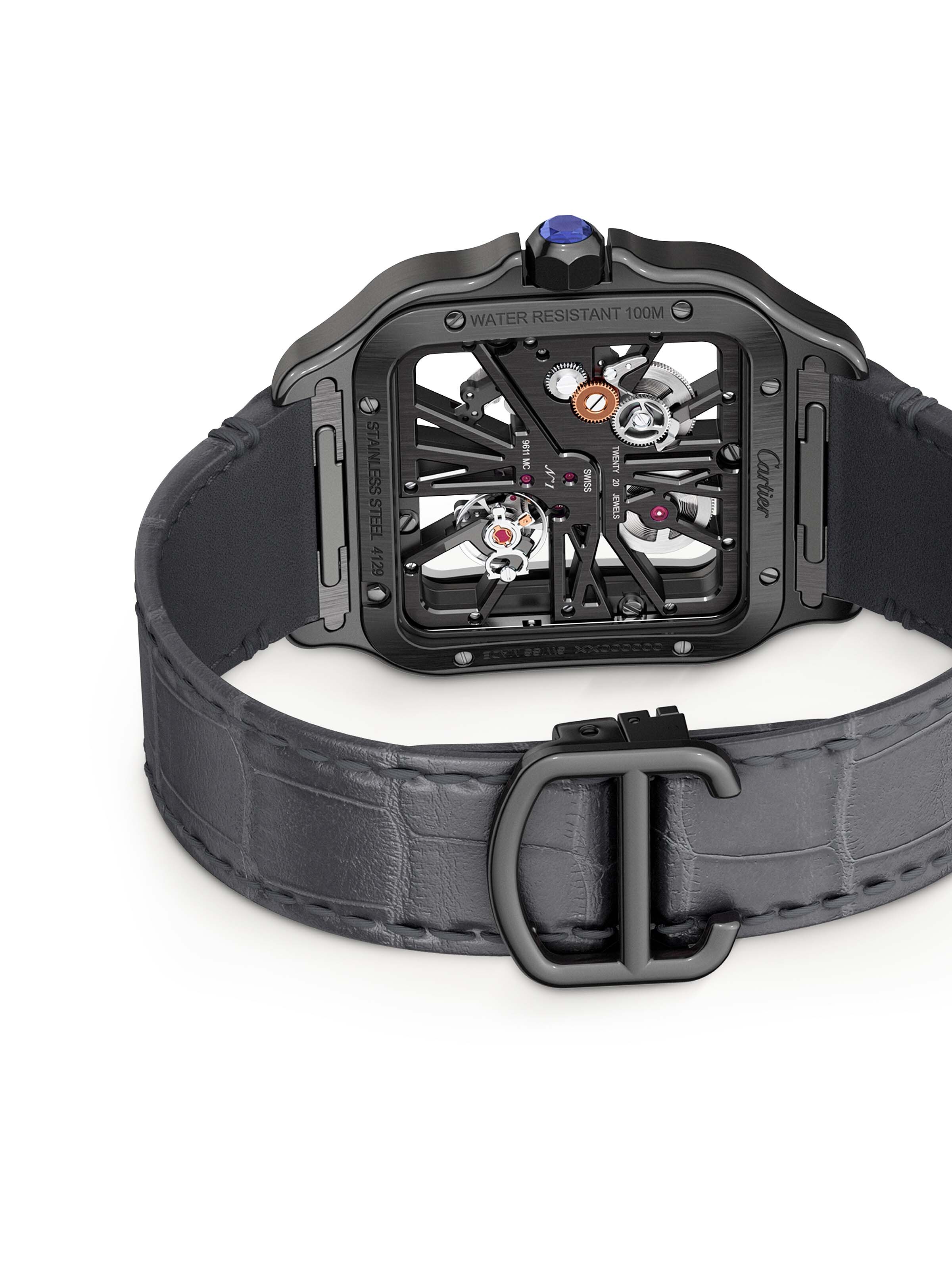 Santos Skeleton watch, large model, Manufacture mechanical movement with manual winding, caliber 9612 MC. Black ADLC steel case, 7-sided crown set with a blue synthetic spinel, polished gray steel sword-shaped hands, sapphire crystal case back. Strap in black alligator leather, with black ADLC steel double adjustable folding buckle. Second strap in dark gray semi-matte alligator leather. Both bracelets are fitted with the “QuickSwitch” interchangeability system. Hours and minutes with skeletonized bridges forming Roman numerals, with luminescent material. Individually numbered movement consisting of 138 parts including 20 jewels. Movement dimensions: 28 mm x 28 mm, movement thickness: 3.97 mm, balance: 28,800 vibrations/hour, power reserve approx. 72 hours. Case width: 39.7 mm, case thickness: 9.08 mm. Water-resistant up to 10 bar (approx. 100 meters).