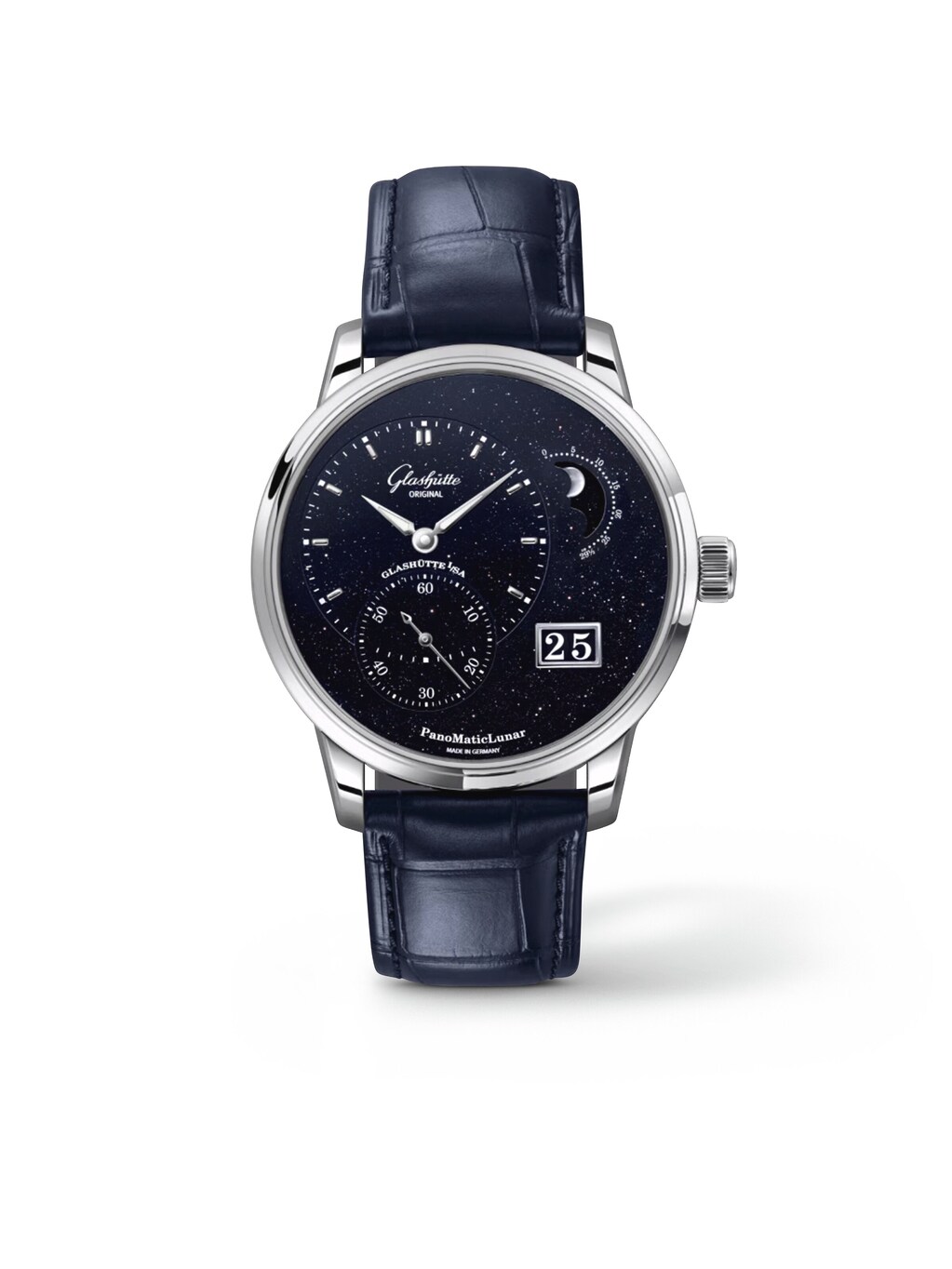 PanoMaticLunar 40 mm, 950 platinum with blue alligator-skin strap, automatic caliber 92-14 with moon-phase display and outsize date display | Reference Number GL500078