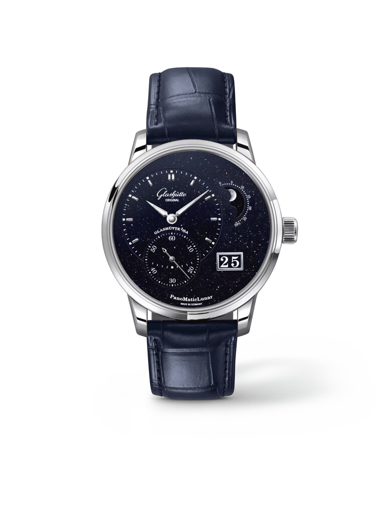 In addition to decentralized hour and minute, decentralized small seconds and the date display in the panorama window, the PanoMaticLunar from Glashütte Original (Ref. 1-92-14-01-03-61) also features one of the most poetic complications, a moon-phase display, on its deep blue dial. In the elegantly curved window, you can see the spectacle of a waxing and waning moon during a cycle lasting 29.53 days. This and the other functions are driven by in-house self-winding movement 92-14. The 40 millimeter stainless steel case comes with a sapphire crystal case back and is fitted with a blue alligator leather strap secured by a folding clasp.