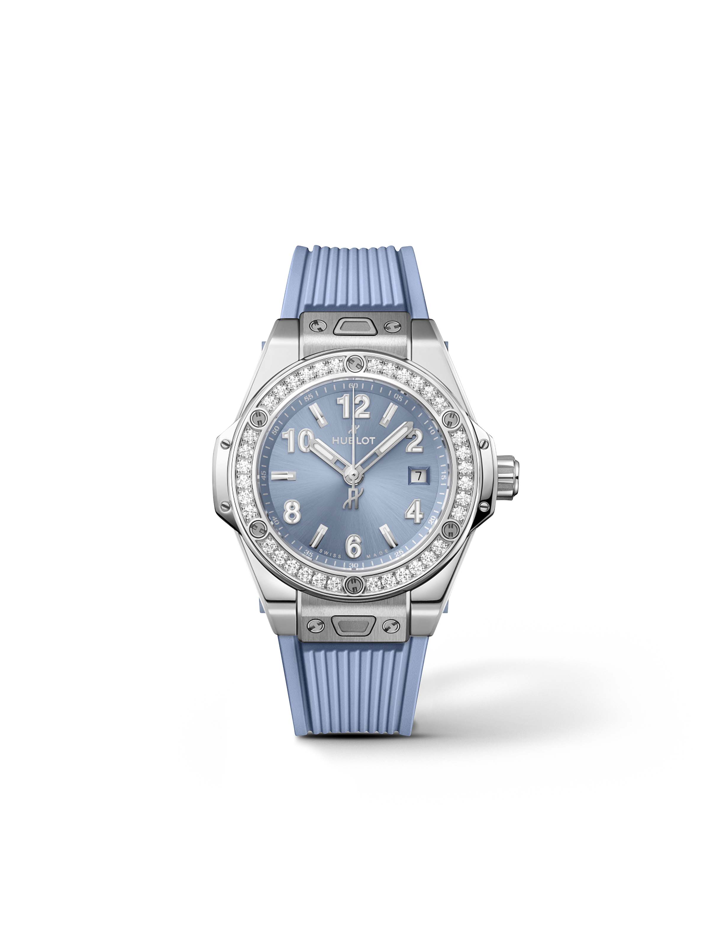 Big Bang One Click Steel Coal Blue Diamonds 33 mm, Edelstahl mit blauem Kautschukarmband, Automatik-Kaliber HUB1120 mit Datumsanzeige | Reference Number HB030089