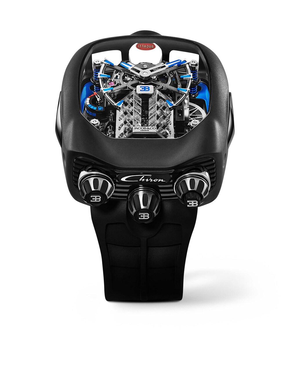 Bugatti Chiron Tourbillon - Titanium Black Edition 55 cm x 44 mm, titanium with black rubber strap, manual winding mechanism manufacture calibre JCAM37 with tourbillon and power reserve indicator | Reference Number JB200002