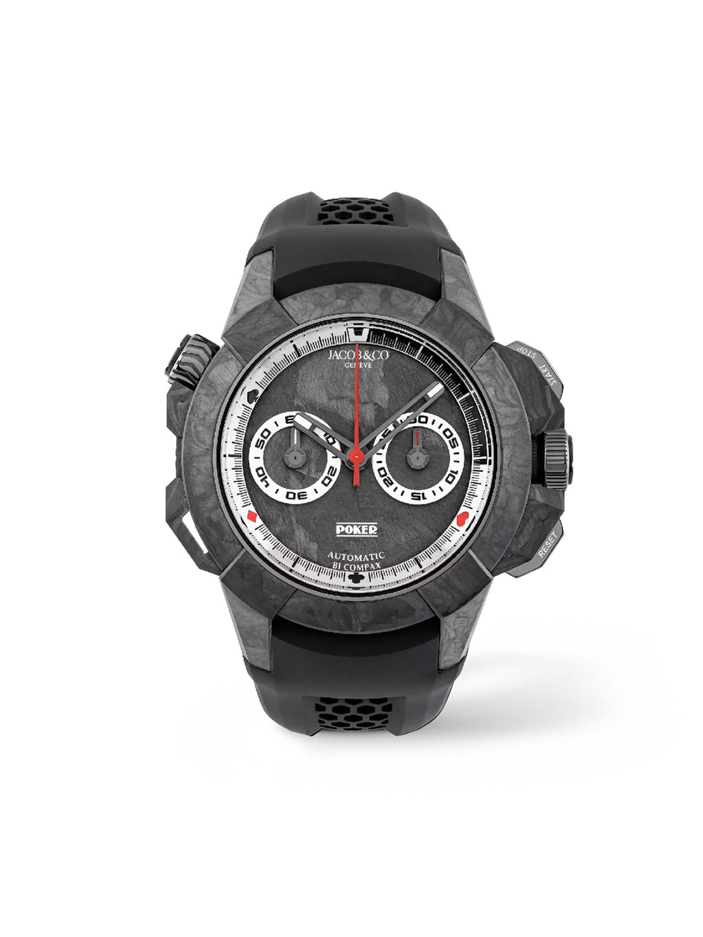Epic X Chrono 44 -Carbon Poker 44 mm, carbon with black rubber strap, self-winding manufacture caliber JCAA05 with chronograph function | Reference Number JB000015