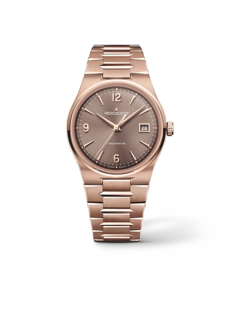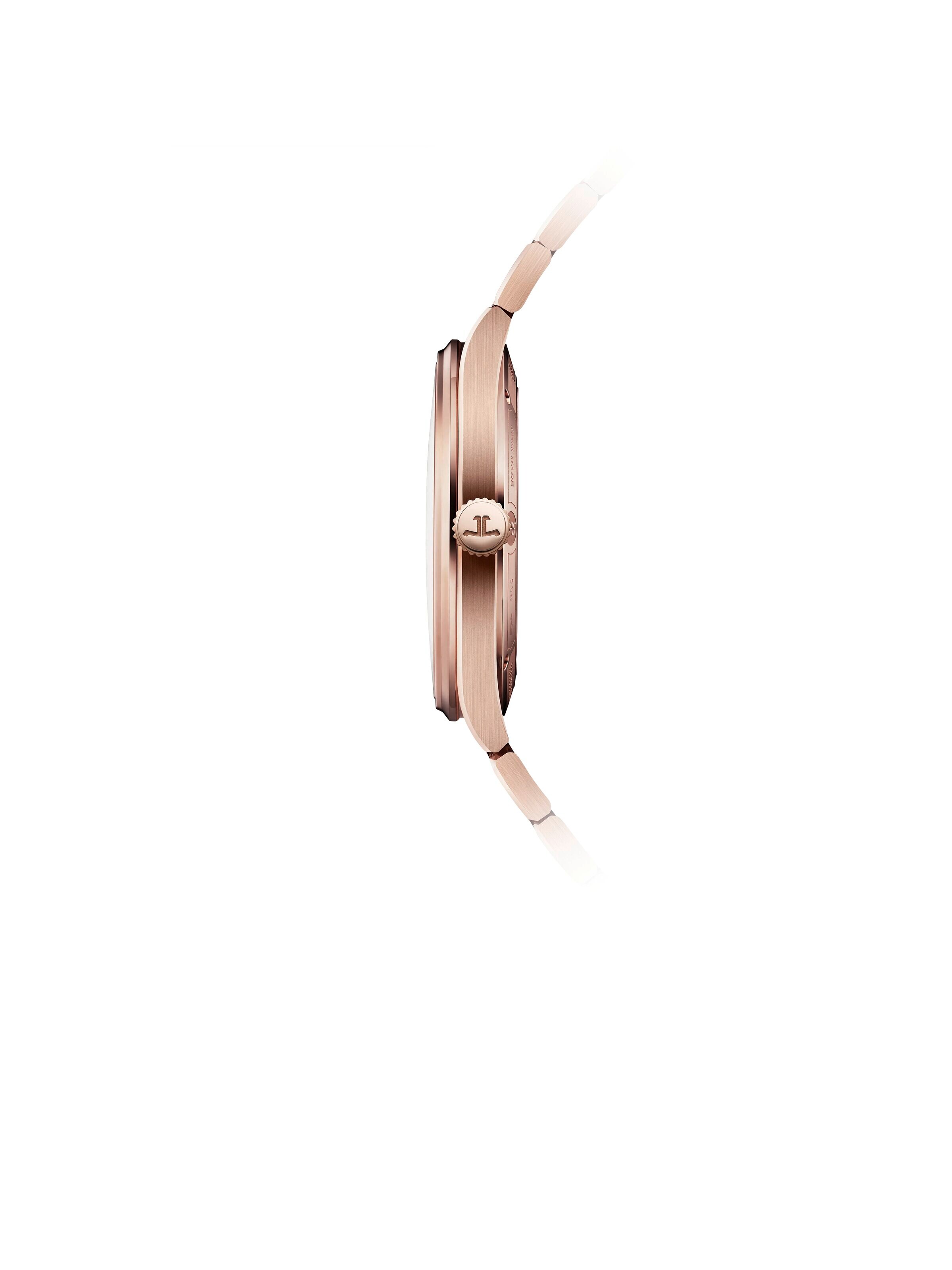 Warmer Rotgoldglanz und ein tiefes Braun des Zifferblatts prägen die ästhetische Ausstrahlung dieser Jaeger-LeCoultre Armbanduhr Ref. 415216J, welche stilvollen Luxus auf dezente Weise interpretiert. Mit einem Durchmesser von 38 Millimeter liegt das feine Gehäuse angenehm ausgewogen am Handgelenk, während das Armband aus 18k Rotgold ein harmonisches Gesamtbild schafft. Klare arabische Ziffern und Indizes verbinden gute Ablesbarkeit mit klassischer Eleganz, die durch eine Zentralsekunde dynamisch akzentuiert wird. Im Inneren arbeitet das automatische Manufakturkaliber 899, welches eine Gangreserve von 70 Stunden bereitstellt und als Chronometer von Contrôle Officiel Suisse des Chronomètres zertifiziert ist. Saphirglas ermöglicht den Blick auf das Uhrwerk und schützt die fein gestaltete Mechanik zuverlässig. Eine Wasserdichtigkeit bis 5 bar und die komfortable Faltschließe runden den Auftritt dieser luxuriösen Armbanduhr ab, welche Präzision, Handwerkskunst und zeitlosen Stil souverän verbindet.