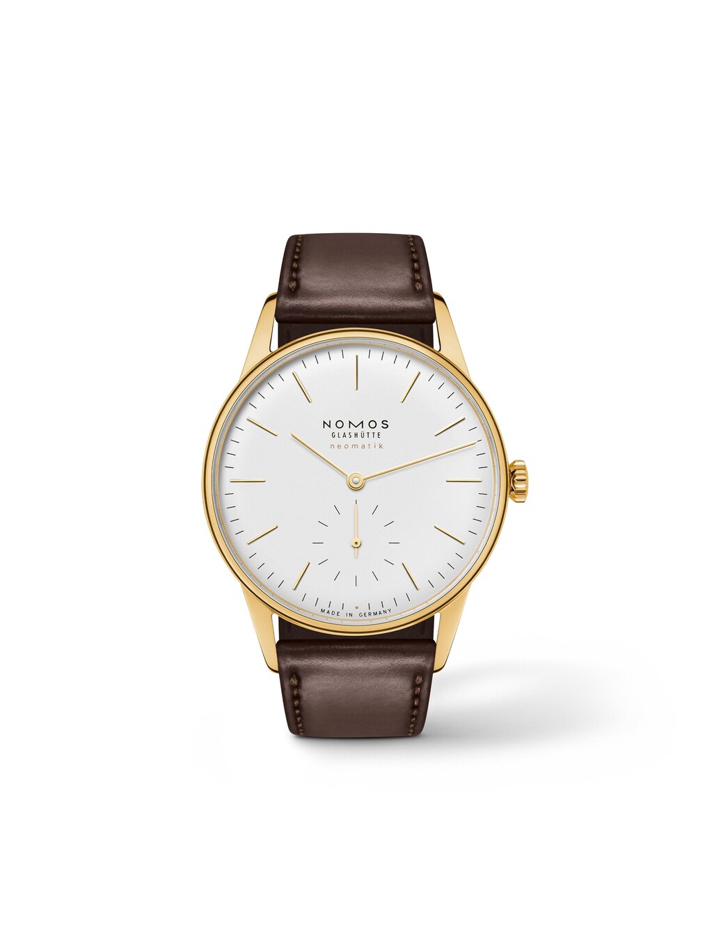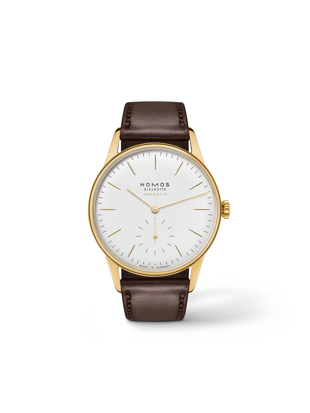 The Nomos Orion Neomatik Ref. 349 combines understated elegance with modern fine watchmaking in a well-balanced 36.4-millimeter case. The slim 18k yellow gold case lends a warm radiance and underscores the minimalist character of the white dial. Delicate hour markers and a small seconds subdial give the dial a clear structure that reduces time to its essentials. Self-winding manufacture caliber DUW 3001 ticks inside the case, designed for precision and a power reserve of up to 43 hours. Sapphire crystal allows a view of the movement while protecting the watch face. Water resistance up to 5 bar complements the everyday practicality of this elegant timepiece. The brown cordovan leather strap caresses the wrist with exceptional suppleness and harmoniously rounds out the aesthetic effect.