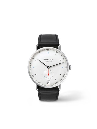 Discover the essence of minimalist elegance with the Nomos Tangente Metro Ref. 1102, a unisex timepiece that transcends the boundaries of traditional watchmaking. Crafted with meticulous attention to detail, this watch features a sleek 38.5 millimeter stainless steel case that houses the innovative DUW 4101 hand-wound movement, a testament to Nomos's commitment to in-house manufacturing excellence. The pure white dial, adorned with index hour markers, provides a backdrop of serene simplicity, allowing the small seconds subdial to subtly capture attention. A date display adds a layer of functionality without compromising the watch's understated charm. Encased in sapphire crystal, with a sapphire crystal case back, the watch's inner workings are protected, while offering a glimpse into the mechanical artistry within. The watch is water-resistant to 5 bar, ensuring durability alongside its aesthetic appeal. Completing this masterpiece is a black Cordovan strap, paired with a pin buckle, that wraps comfortably around the wrist, securing the watch with timeless elegance. With a power reserve of 52 hours, the Nomos Tangente Metro Ref. 1102 stands as a symbol of enduring beauty and precision, making every moment count.