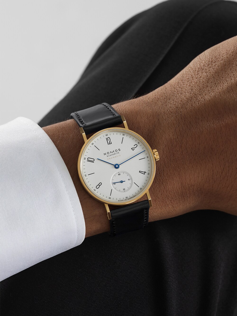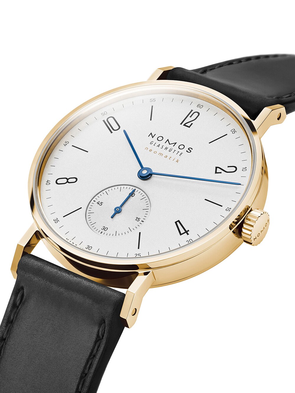 Discover elegance redefined with the Nomos Tangente Ref. 161, a masterpiece that encapsulates the essence of minimalistic luxury. Crafted from 18k yellow gold, this timepiece is a testament to understated sophistication. Its 35-millimeter diameter ensures a presence on the wrist that is both noticeable and refined. The white dial, adorned with Arabic numerals, offers a canvas of purity and clarity, enhancing the watch's readability. This exquisite piece is powered by an automatic movement, promising precision and reliability, while the sapphire crystal case back reveals the meticulous craftsmanship that Nomos is renowned for. A black Cordovan strap complements the watch, providing a comfortable fit and adding to its classic appeal. Water-resistant up to 3 bar and boasting a power reserve of 43 hours, this watch is not just a timekeeper but a statement of elegance that stands the test of time. Finished with a pin buckle, the Tangente Ref. 161 is a symbol of sophistication that speaks to those who appreciate the finer things in life.