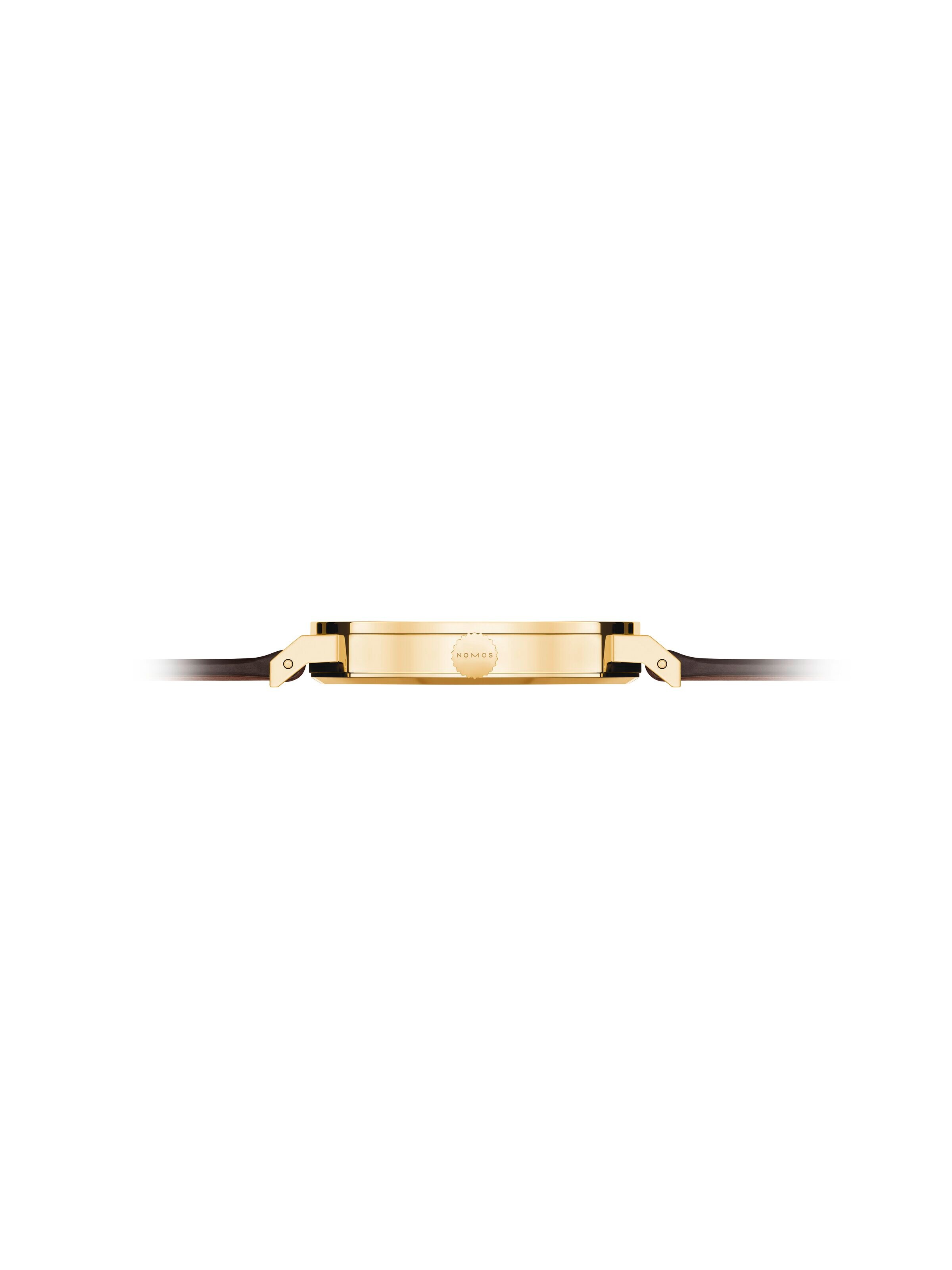 This Nomos automatic wristwatch (Ref. 196) strikes a perfect balance between minimalist clarity and precious materials. The slim 38.5-millimeter case in 18k yellow gold adds a warm touch that subtly highlights the white dial with Arabic numerals and hour markers. The small seconds subdial lends a calm, classic look, while the date display conveniently structures daily life. Inside, the manufacture calibre DUW 6101—a self-winding movement with a power reserve of up to 50 hours—ensures reliable precision. Sapphire crystal offers a view of the dial and movement, underscoring the watch’s high-quality standards. The brown cordovan leather strap completes the look with a natural, elegant touch. With a water resistance of 3 bar, this watch is ideal for daily wear without losing its luxurious appeal.