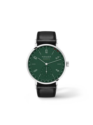 This Nomos self-winding watch (Ref. 148) combines clean design with fine craftsmanship. The green dial creates a modern, distinctive look, structured by Arabic numerals and hour markers. A small seconds subdial lends the design additional dynamism and emphasizes the timepiece’s understated appearance. The stainless steel case, with a diameter of 38.5 millimeters, looks balanced and confident on the wrist. Inside the case, the DUW 6101 self-winding movement—a manufacture caliber with a power reserve of up to 50 hours—delivers reliable precision. A date function adds practical value to the time display for everyday use. Sapphire crystal provides an unobstructed view of the dial and movement while reliably protecting them against external influences. Water-resistant to 5 bar, the watch is as robust as it is stylish. The black cordovan leather strap with a folding clasp underscores the high-quality impression and ensures comfortable wear.