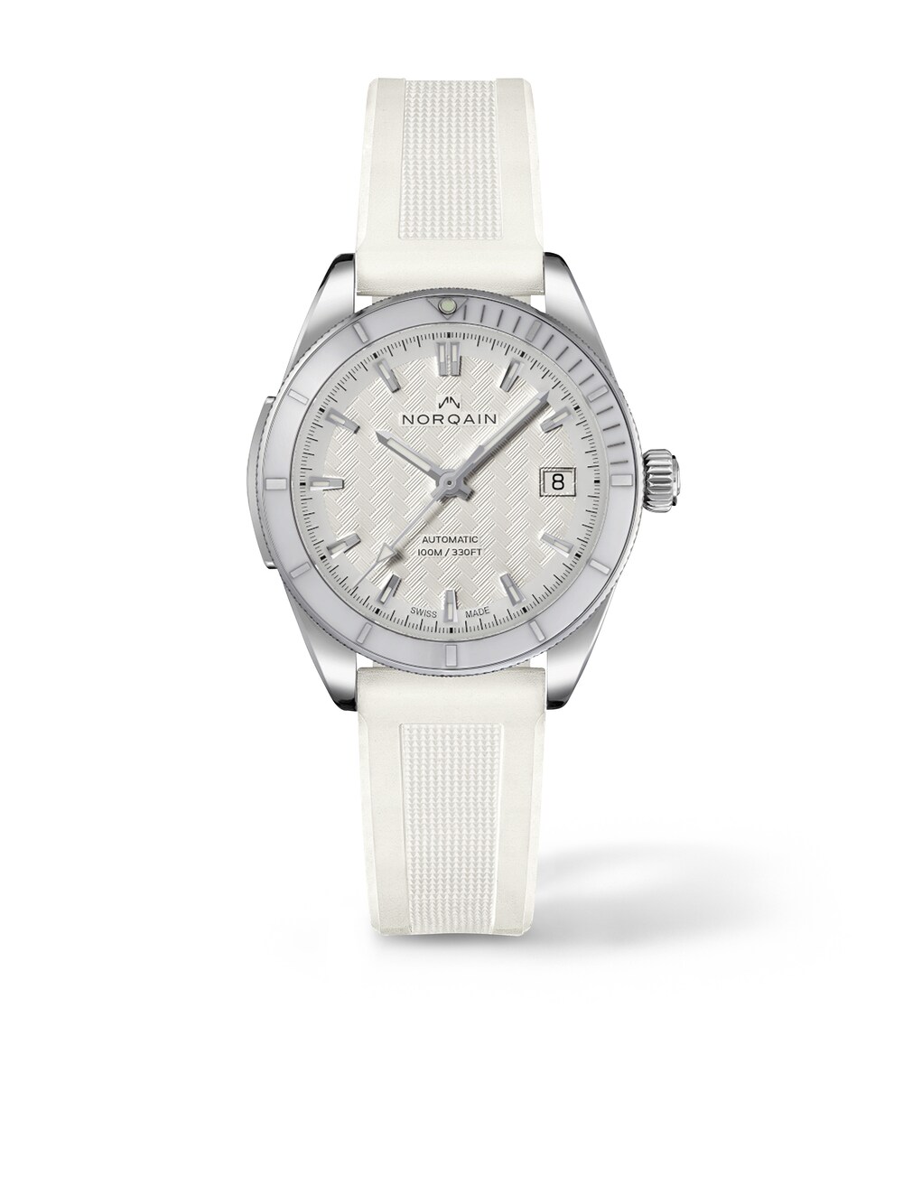Discover elegance that embarks on an adventure – the Norqain Adventure Sport Lady, a timepiece that redefines the essence of a women's wristwatch with its blend of sophistication and resilience. Crafted for the woman who appreciates the beauty of life's journeys, this watch is a testament to enduring style and functionality. Its 37 millimeter stainless steel case houses a pristine white dial, set under a durable sapphire crystal, ensuring clarity and protection. The white rubber strap, comfortable and chic, complements the adventurous spirit of its wearer, securing with a pin clasp for a perfect fit. At the heart of this exquisite piece beats the NN09 caliber, an automatic movement that promises reliability with a power reserve of 38 hours. The ceramic bezel adds a touch of modernity, while the sapphire crystal case back offers a glimpse into the watch's inner workings. Water-resistant to 10 bar, it is ready for any challenge. The date function and central second hand enhance its practicality, making the Norqain Adventure Sport Lady not just a watch, but a companion for every moment.