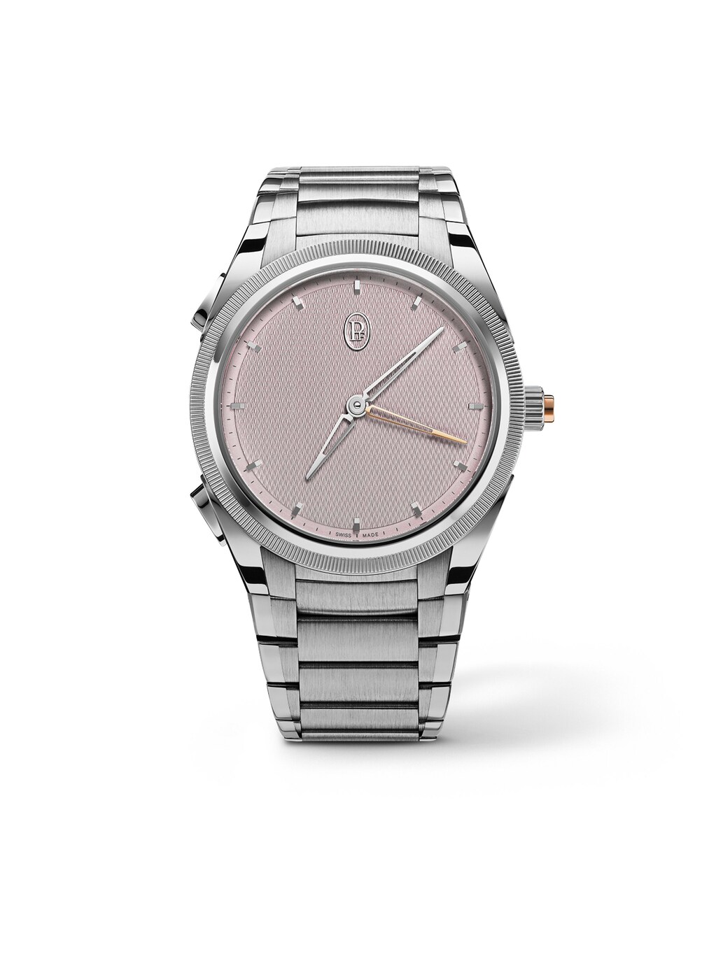 The Parmigiani Fleurier PF (Ref. PFC904-1020002-100182) combines understated luxury with technical finesse. The 40-millimeter stainless steel case sits comfortably on the wrist and looks particularly elegant thanks to its striking platinum bezel. On the rose-colored dial, delicate hour markers add subtle accents and, together with the clearly defined hands, ensure excellent readability. Inside, the self-winding manufacture caliber PF052 operates, offering a power reserve of up to 48 hours and designed for reliable precision. Sapphire crystal allows a view of the dial and movement, underscoring the manufacture’s high standards of craftsmanship and attention to detail. A stainless steel bracelet with a folding clasp ensures a comfortable fit and blends harmoniously into the overall design. With water resistance up to 6 bar, the watch retains its luxurious character with confidence even in everyday use.