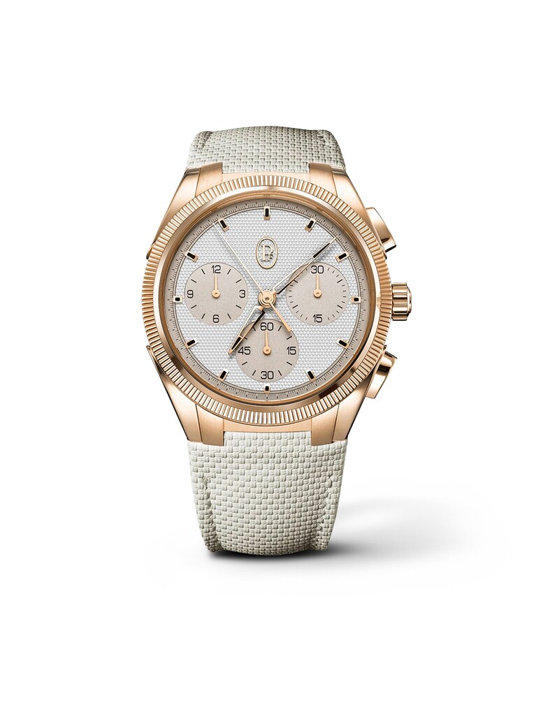 The Parmigiani Fleurier PF SPORT Ref. PFC931-2020021-400182 combines sporty elegance with a luxurious aura. The 42-millimeter 18k rose gold case sits strikingly yet harmoniously on the wrist, creating a warm contrast to the silver-colored dial with its clearly defined hour markers. A small seconds subdial provides a lively yet very calm display of time, underscoring the understated elegance of the design. Inside, the self-winding manufacture caliber PF070 powers the watch; its precision is confirmed by certification from the Contrôle Officiel Suisse des Chronomètres, and it offers a power reserve of up to 65 hours. Sapphire crystal allows a view of the finely finished movement while protecting the front of the watch. Water-resistant to 10 bar, the watch is therefore also suitable for everyday contact with water. A cream-colored rubber strap with a folding clasp ensures high comfort and a secure fit.