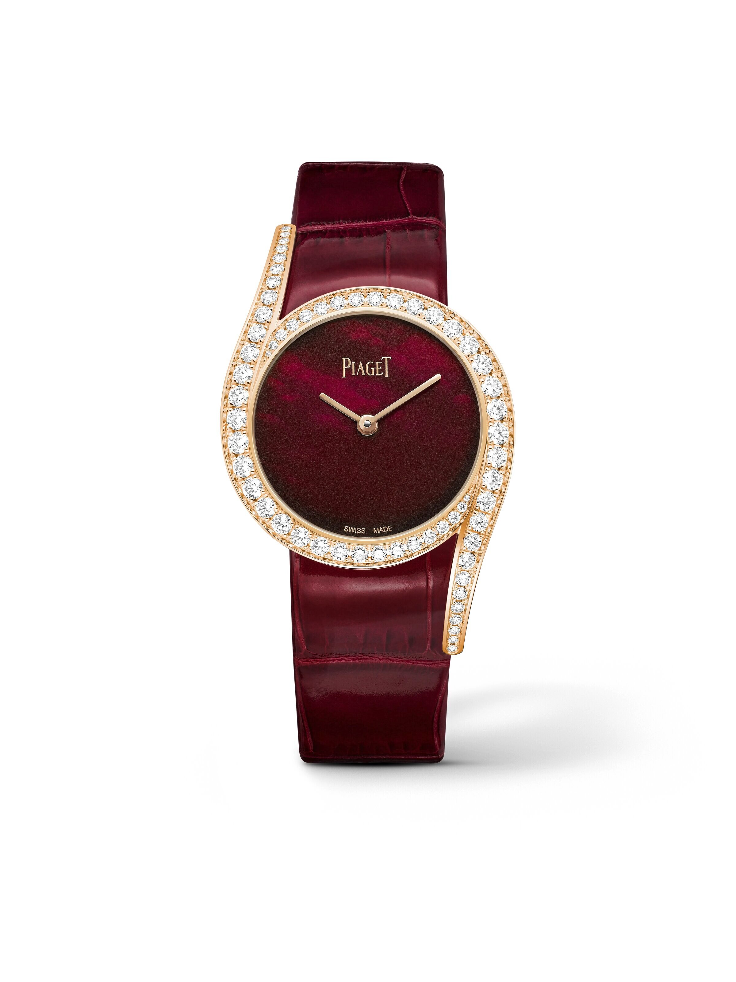 Elegantly and confidently, the Piaget Limelight Gala G0A50363 makes a statement on any occasion. This 32 mm ladies’ watch features a case crafted from 18 k rose gold, adorned with 62 brilliant-cut diamonds (approx. 1.64 ct). The mother-of-pearl dial is artfully enhanced with translucent dark burgundy lacquer, while the elongated lugs, like the bezel, highlight the distinctive and recognizable design of the Limelight Gala. The burgundy alligator leather strap is complemented by a refined clasp set with an additional brilliant-cut diamond (approx. 0.007 ct). Inside, the mechanical 501P1 manufacture movement with automatic winding can be admired through the sapphire crystal case back. Please note that carat weight, number of stones, and dimensions may vary depending on the size of the creation.