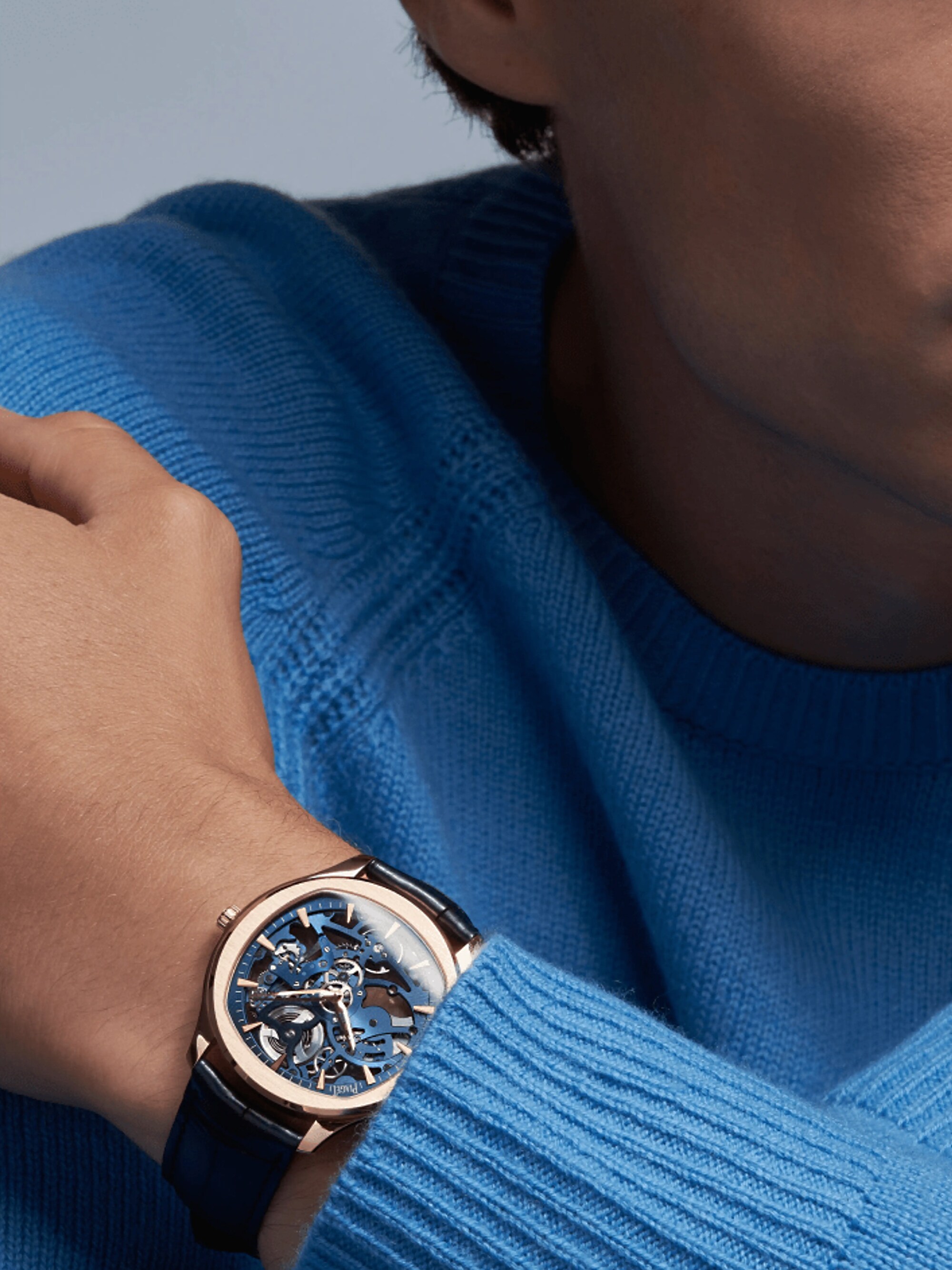 The Polo Skeleton, with its 42 mm rose gold case, unites the signature hallmarks and strengths of Maison Piaget. Since the 1970s, the Piaget Polo collection has embodied the essence of luxury sports watches. This new interpretation combines the iconic cushion-and-round case shape with Piaget’s mastery in skeletonization, showcased in the self-winding Manufacture caliber 1200S1, featuring a slate-grey rotor and elegant blue accents. The timepiece is completed with an interchangeable blue alligator leather strap, merging technical sophistication with a bold, contemporary style—a true luxury sports watch for the modern gentleman.