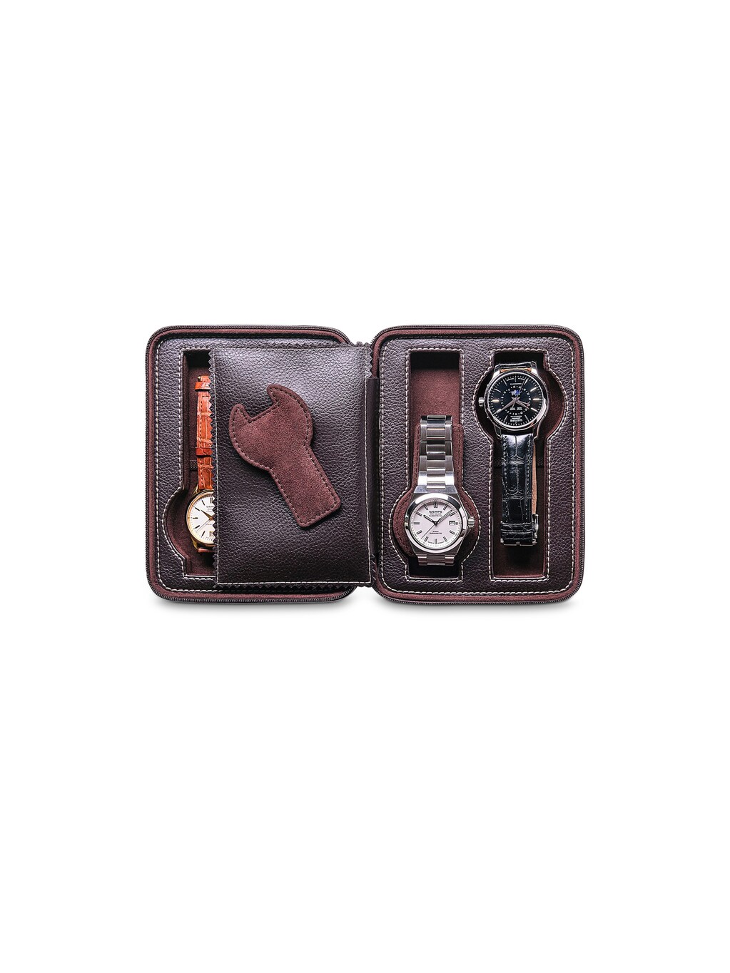 Elegant watch storage for exclusive timepieces, for at home and on the move. The WP04 zip pouch from Leanschi provides space for four watches. Each of these watches can measure up to 50 millimeters in diameter. Two protector pads come supplied for watches with metal bracelets. This carry box with a chocolate-brown, leather-like appearance and white stitching measures 13.5 x 5.5 x 17.5 centimeters. It is handy and compact in your safe as well as when traveling.