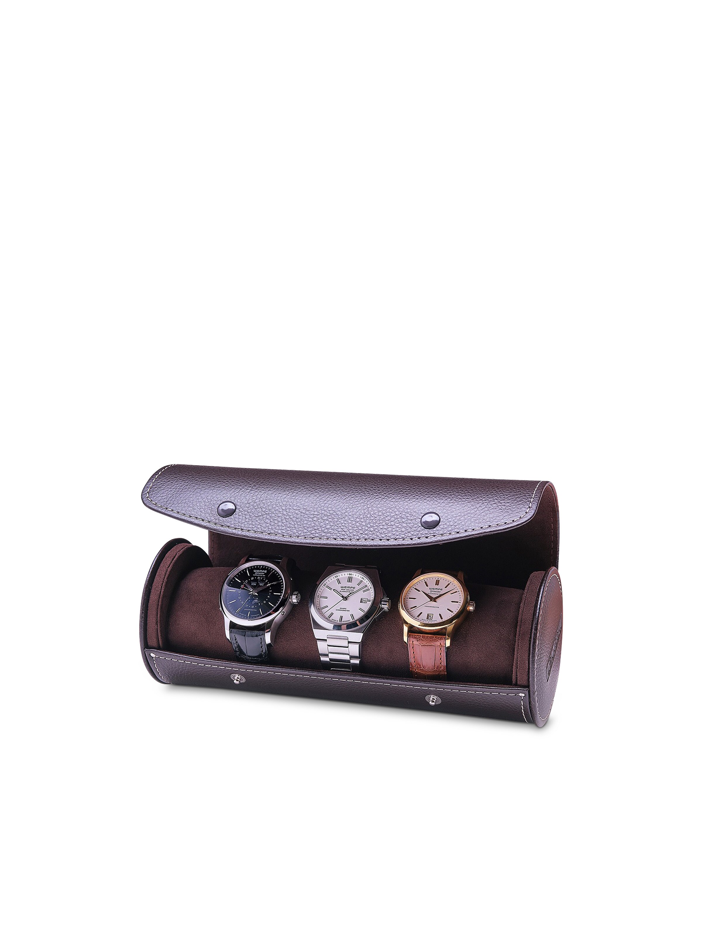 Elegant watch storage for exclusive timepieces, for at home and on the move. The WRO3 watch roll from Leanschi provides space for three to four watches. This carry box with a chocolate-brown, leather-like appearance and white stitching measures 8.5 x 8.5 x 22 centimeters. Whether in your safe or traveling with you in your carry-on, this watch roll is handy and compact.