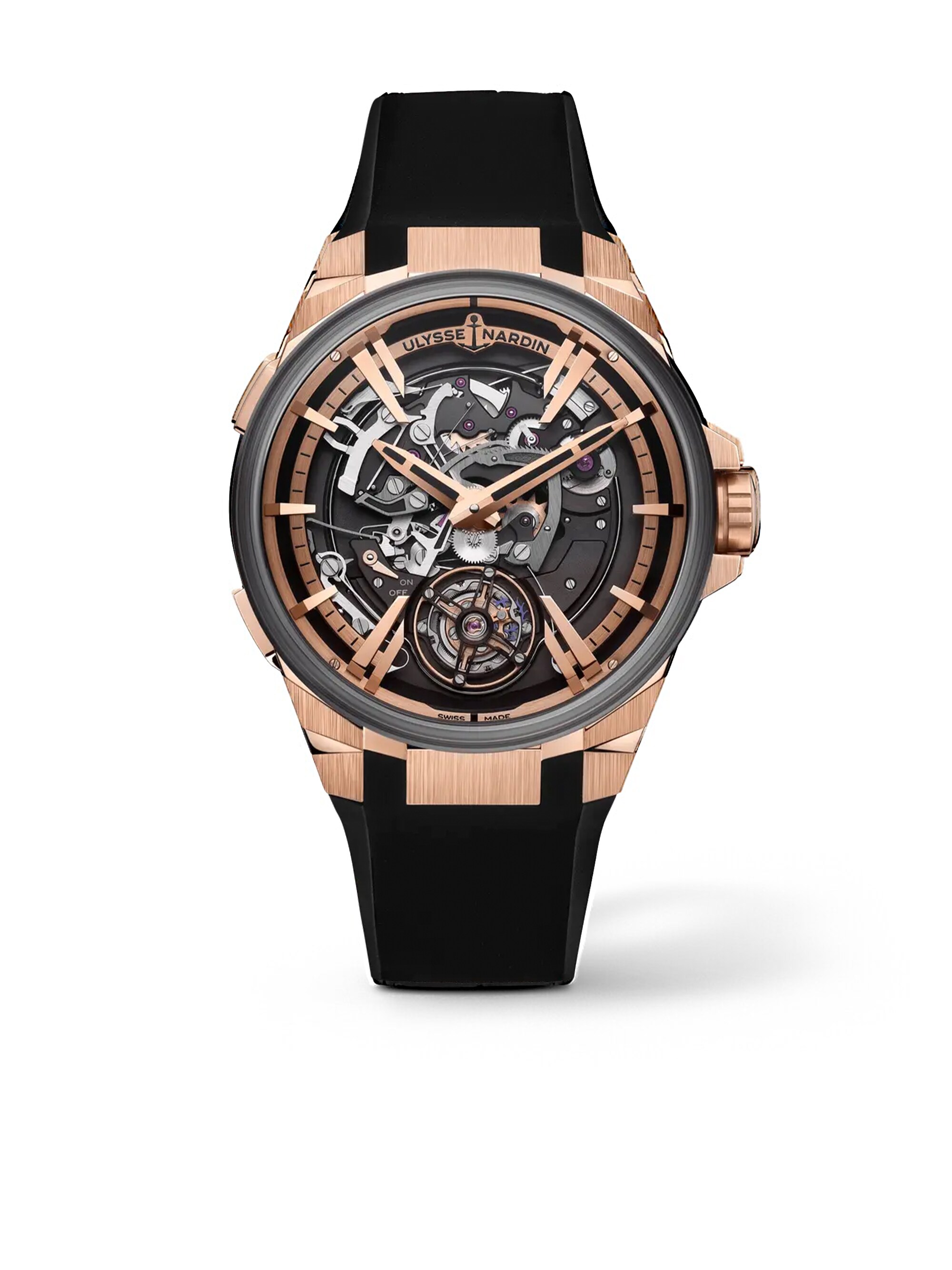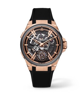 The Ulysse Nardin Executive Blast, reference 6215-400-3A/02, is a symphony of precision engineering and aesthetic mastery, designed for the discerning gentleman who seeks more than just a timepiece. Crafted with an exquisite blend of 18k rose gold and titanium, this watch is a testament to Ulysse Nardin's commitment to innovation and luxury. Its skeleton dial reveals the intricate beauty of the UN-621 manufacture caliber, a marvel of automatic movement that powers the sophisticated tourbillon and striking mechanism. Encased in durable sapphire crystal, the watch boasts a robust 45-millimeter diameter, ensuring a commanding presence on the wrist. The black rubber strap complements the watch's bold design, while the ceramic bezel adds a touch of modern elegance. With a water resistance of 3 bar and a power reserve of 60 hours, this timepiece is as functional as it is beautiful. The watch is secured with a folding clasp, ensuring comfort and security for the wearer. The Executive Blast is a masterpiece of horological artistry, offering an unparalleled blend of functionality, durability, and style.