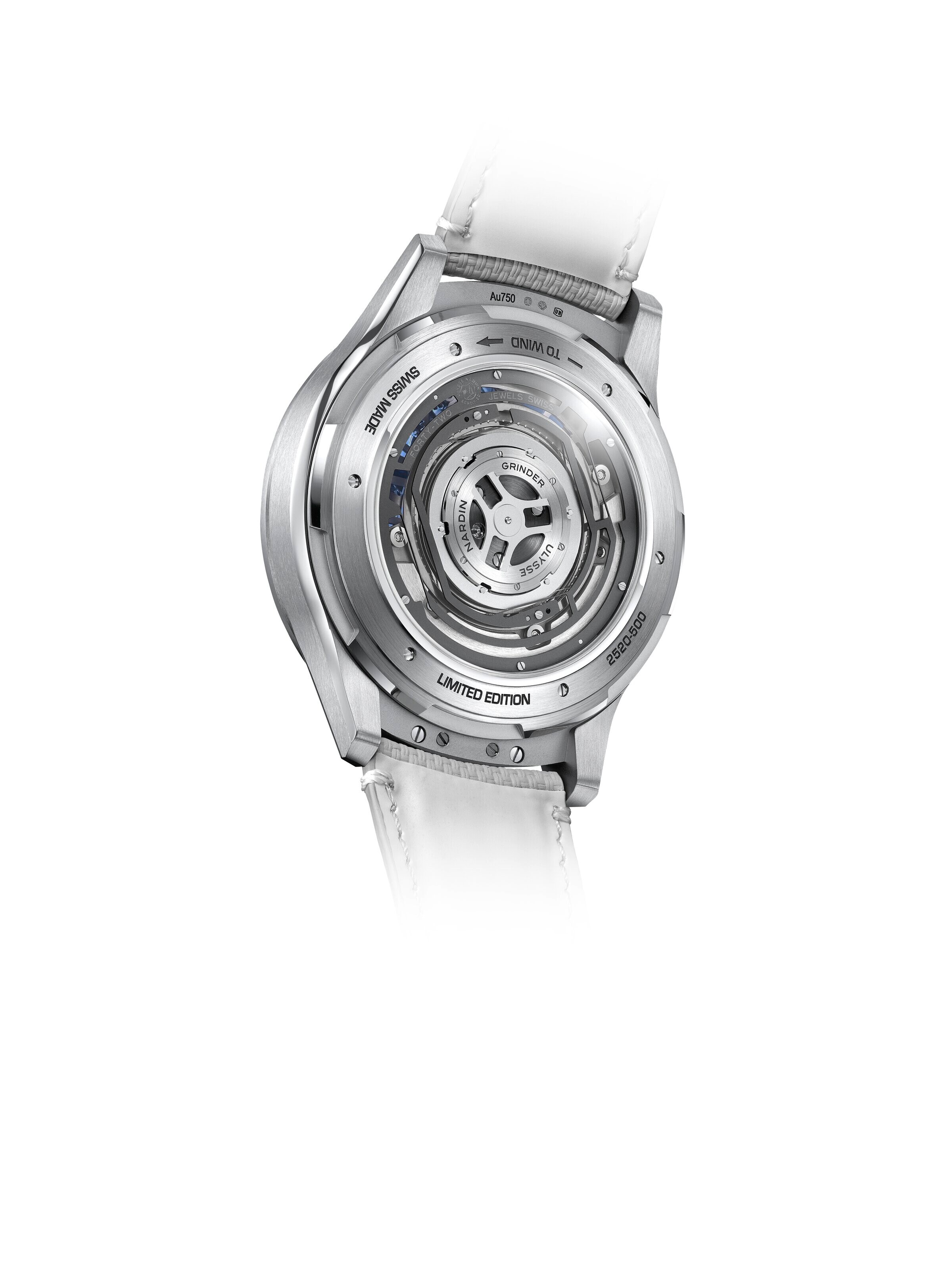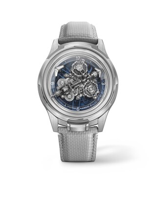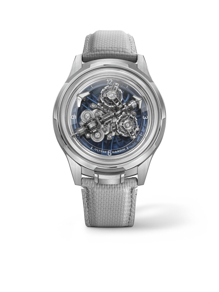 This watch from Ulysse Nardin (Ref. 2520-500LE-3A-BLUE/3A) combines avant-garde aesthetics with fine watchmaking. The 44-millimeter case in 18k white gold lends the exceptional design an expressive presence on the wrist and underscores its luxurious character. Limited to just 50 watches, this edition is aimed at connoisseurs of rare creations who appreciate individuality and technical finesse. The fine timepiece is powered by self-winding manufacture caliber UN-252, offering an impressive power reserve of up to 72 hours and ensuring reliable precision. Sapphire crystal provides a view of the dial and movement while ensuring high scratch resistance. The white gold bezel blends harmoniously into the overall design and frames the clearly designed hour markers and Arabic numerals, which ensure excellent readability. A gray rubber strap rounds off the modern character and ensures a pleasantly lightweight feel, while water resistance up to 3 bar confidently handles everyday life.