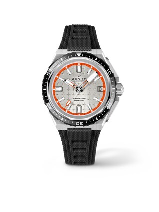 The Zenith Defy Extreme Ref. 95.9600.3620/01.I300 presents a striking, contemporary interpretation of mechanical precision. The 42.5-millimeter titanium case gives the timepiece an impressive presence while remaining lightweight to wear. Clear indices and a central seconds hand on the silver-colored dial ensure excellent readability, while the ceramic bezel underscores the sporty, robust character. Inside, the self-winding El Primero 3620 CS caliber offers a power reserve of up to 60 hours and is designed for reliable performance in everyday use. Sapphire crystal allows a view of the finely finished movement while protecting the front. The watch, which is water-resistant to 6 bar, is held in place by a black rubber strap equipped with a comfortable folding clasp, harmoniously rounding off its sporty, luxurious appearance.
