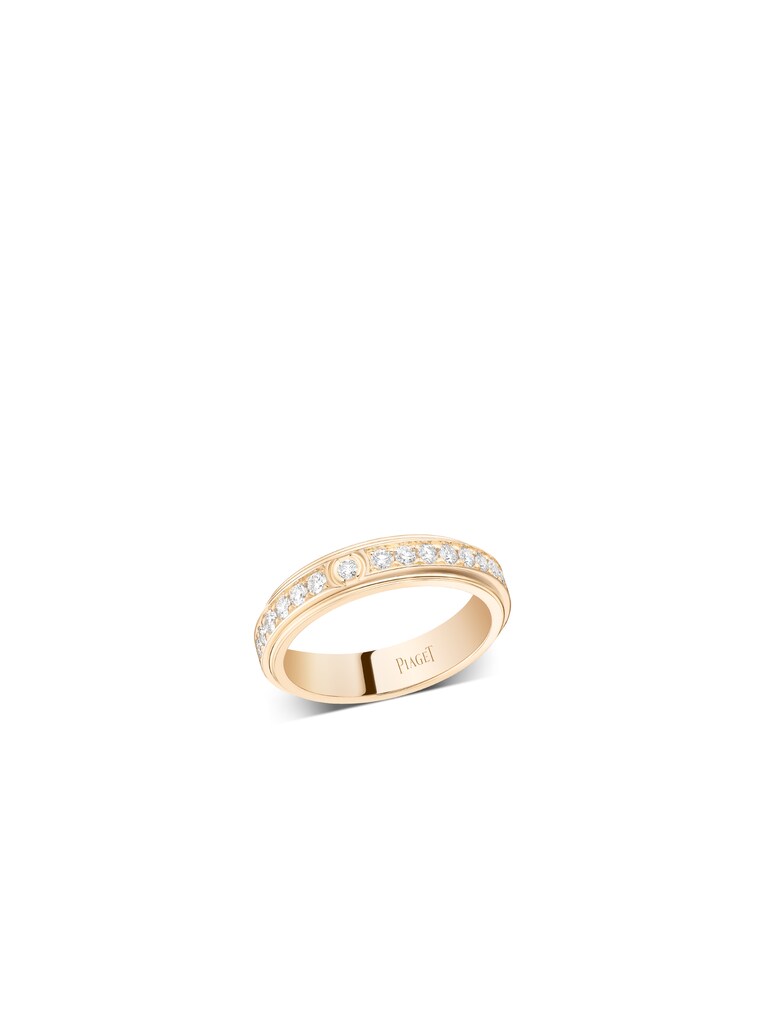 Elegance in motion. The Piaget Possession jewelry collection presents fascinating diamond jewelry with rotatable elements. The special feature of the elegant Possession eternity ring in 18k rose gold is the freely rotating ring band in the center that is entirely set with 37 sparkling brilliant-cut diamonds of 0.56 ct. The dynamic rotation of the turning ring releases positive energy and boosts self-confidence. A fascinating companion that you will never want to take off.