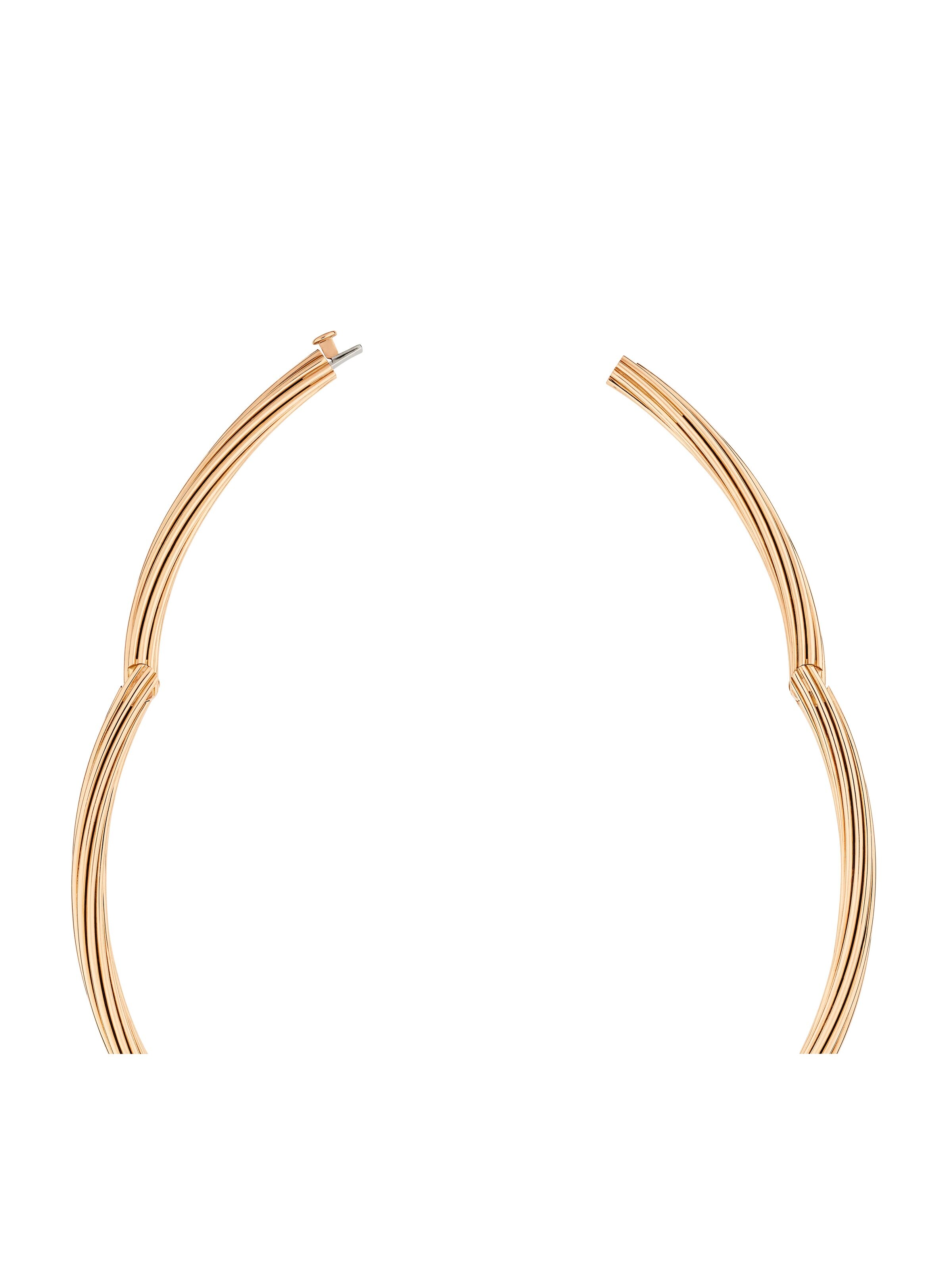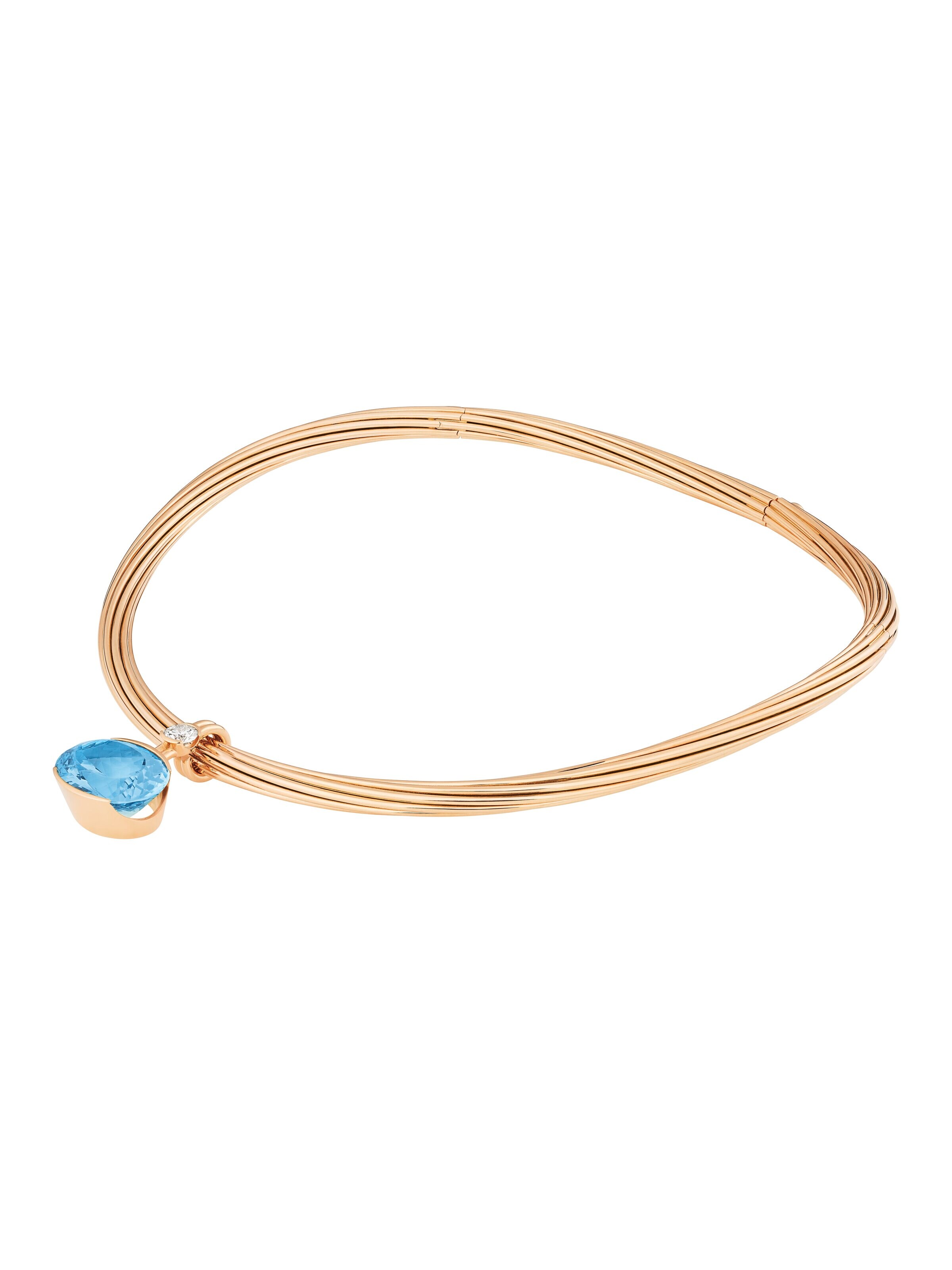 Inspired by the golden hour, when light becomes jewelry. We are celebrating the 25th anniversary of our jewelry brand BY KIM with a masterpiece made of gold, colored gemstones, and diamonds. The rigid Ikone Helioro BY KIM necklace in 18k rose gold shines as an anniversary creation together with a detachable pendant that combines a 23.44 ct oval-cut aquamarine with a small round brilliant-cut diamond of 0.75 ct. Set like a ray of sunshine on the skin, this elegant necklace shines together with its wearer. Sensual. Powerful. Radiant.