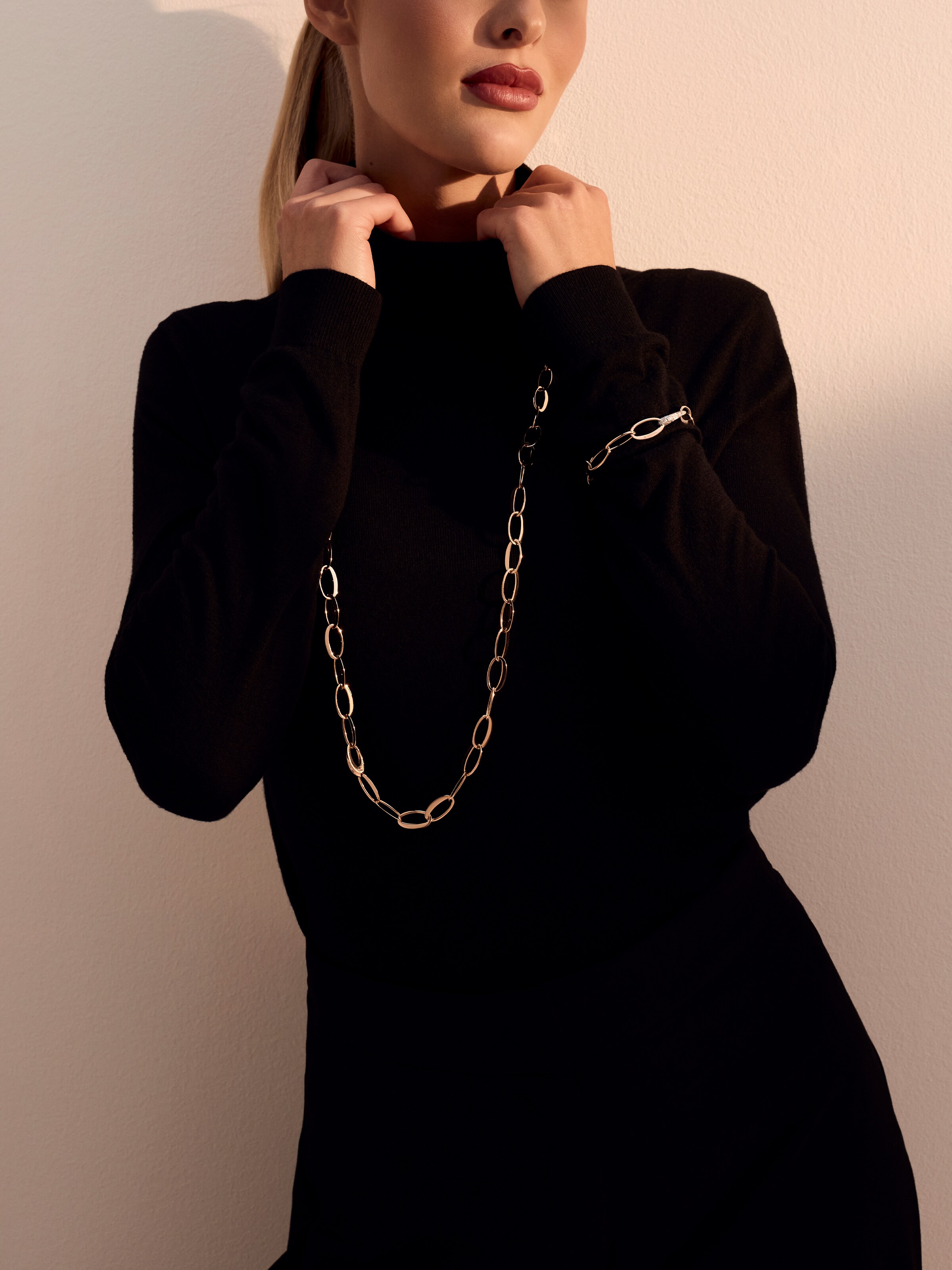 Two become one: Two Écaille necklaces were joined together to create the 97-centimeter Écaille 11 necklace from IsabelleFa. A typical feature of the collection are the flat, oval chain links made of 18k rose gold, which lend the jewelry a playful lightness. Another typical feature is the swivel clasps that can be used to separate or join the necklaces, which are adorned with a small brillant-cut diamond.