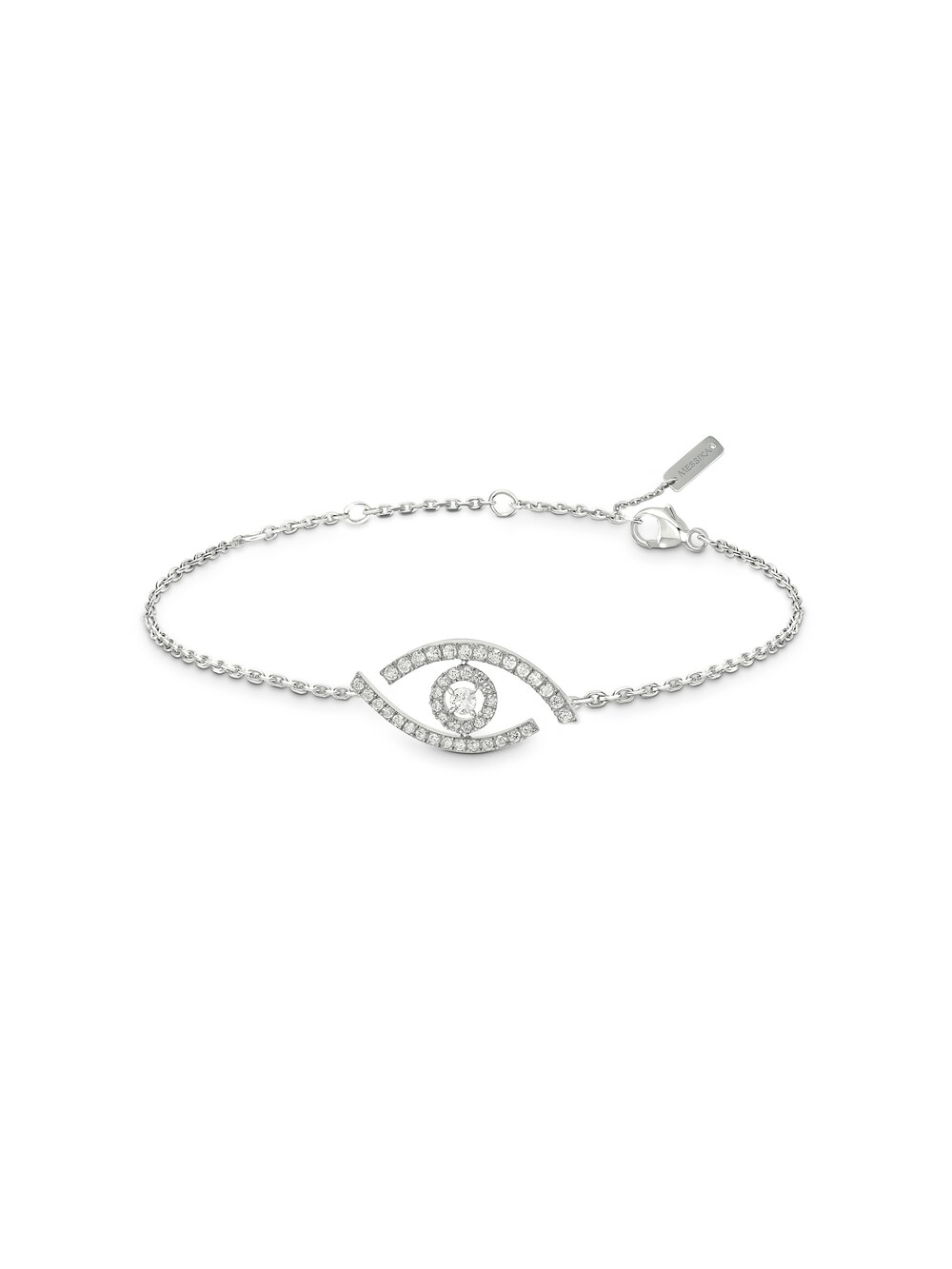 All Eyes on Messika: The motif of the Lucky Eye bracelet is reminiscent of the magic Horus eye from ancient Egypt. This is not a coincidence: The bracelet is part of the Maison's lucky charm collection. Made of 18k white gold and set with diamonds, the design becomes a modern interpretation of old traditions without losing anything of its original magic.