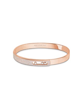 A must-have for fashionistas who love minimalistic jewelry with clear lines, but are nevertheless looking for something special. The slim Move Nova bangle in 18k rose gold is partially pavé-set with diamonds. The three iconic diamonds of the Move collection take center stage. They are symbols of the timeless love of yesterday, today, and tomorrow. This makes the bangle a highlight piece for every day, which loses nothing of its striking impact when worn together with other bangles or bracelets.