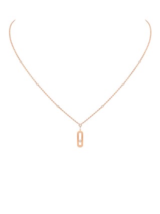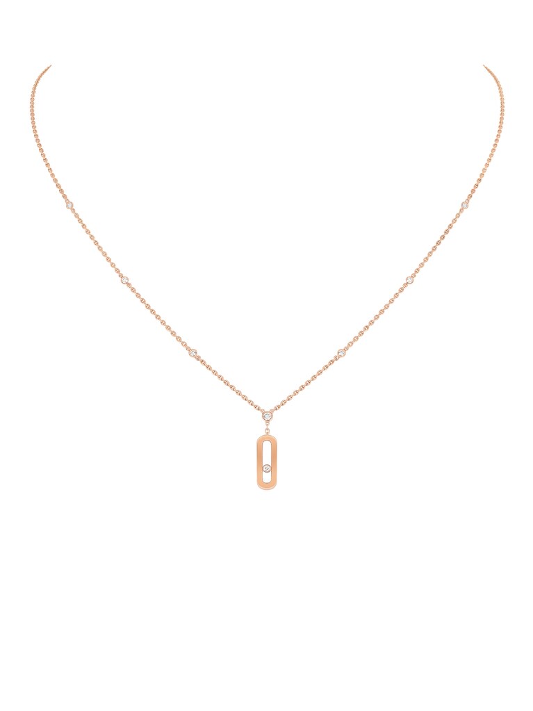 Capture all your special moments and turn each of them into a brillant statement. The expressive eye-catcher of the Move Uno pendant in warm shimmering 18k rose gold is the Move cage, an almost iconic feature of Messika, which holds a single, freely moving diamond. The cage pendant comes on a 55-centimeter necklace adorned with another six diamonds. A piece of jewelry in a clear, graphic design that you will never want to take of again.