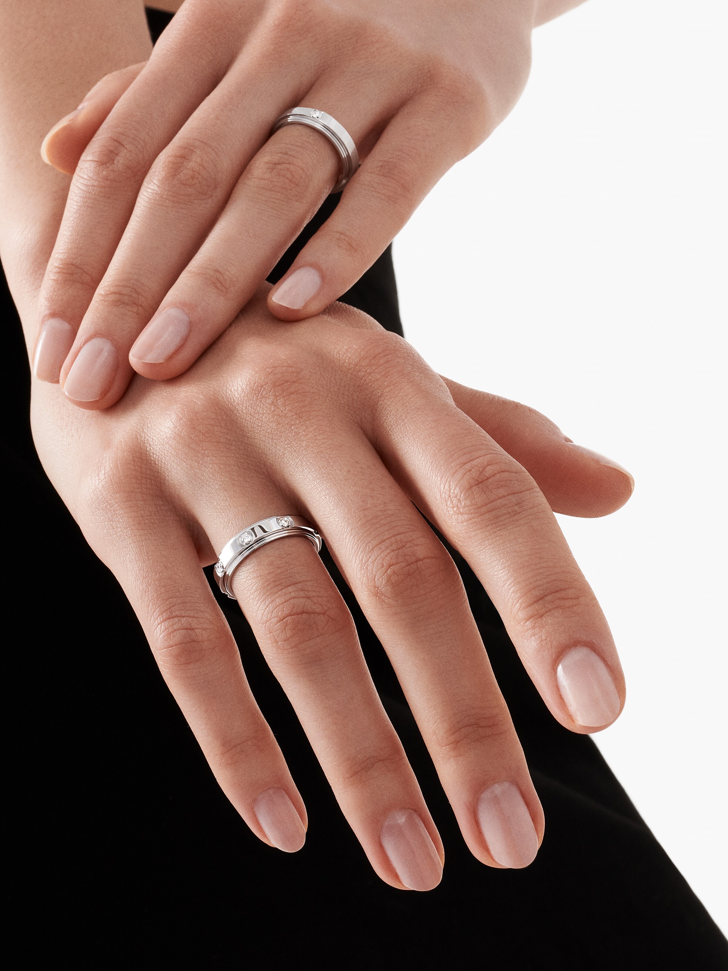 A successful combination of playful elegance and discreet luxury. The Possession ring from Piaget focuses on clear lines and the sparkle of seven brillant-cut diamonds of approx. 0.13 ct. The special feature: Two ring bands lie on top of each other and rotate around each other dynamically. The ring in radiant 18k white gold and with a width of 4.8 millimeters can be perfectly combined with other rings and gives your outfit a dynamic touch.