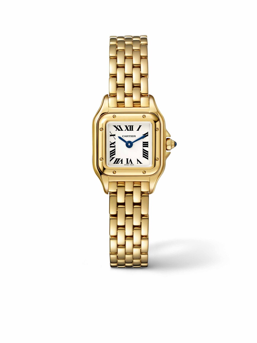 Panthère de Cartier watch, mini model, quartz movement. Yellow gold 750/1000 case and bracelet. Yellow gold 750/1000 octagonal crown set with a sapphire cabochon. Silver dial, blued-steel sword-shaped hands, sapphire crystal. Case dimensions: 25 mm x 19 mm, thickness: 6 mm. Water-resistant up to 3 bar (approx. 30 meters/100 feet).