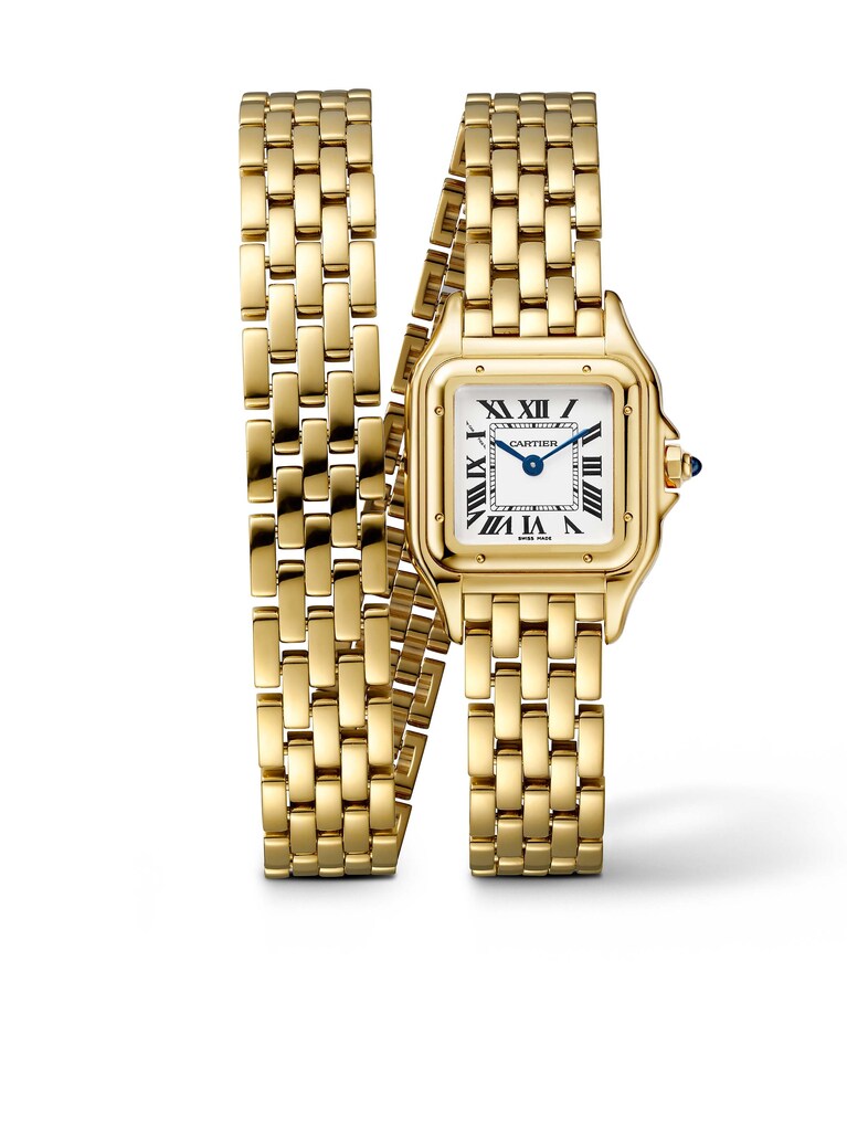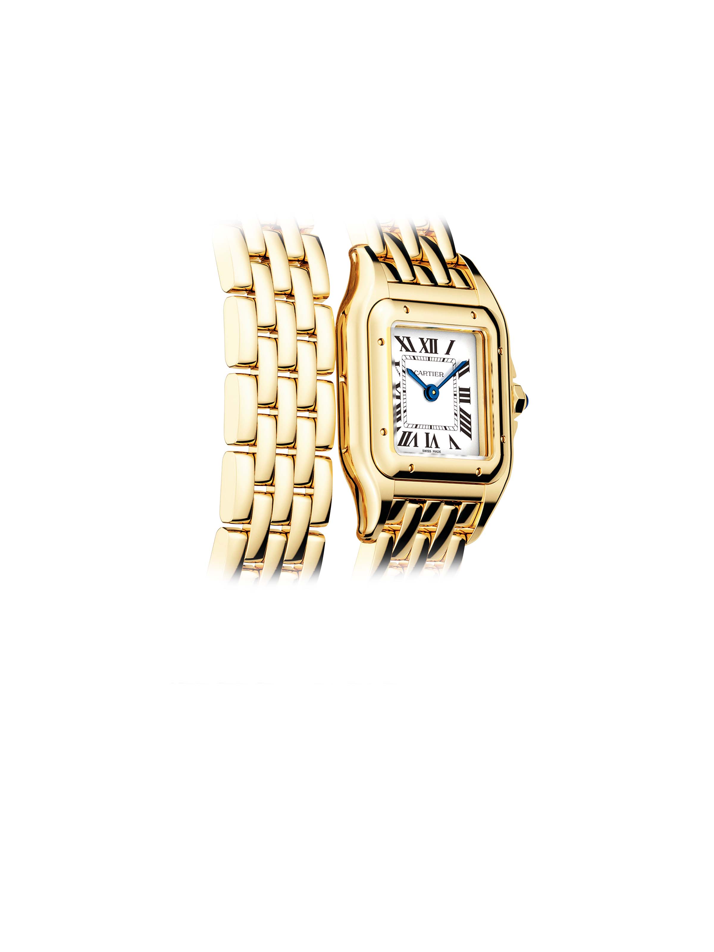 Panthère de Cartier watch, small model, quartz movement. Case in yellow gold 750/1000, dimensions: 23 mm x 30 mm, thickness: 6 mm, crown set with a sapphire, silvered dial, blued-steel sword-shaped hands, yellow gold 750/1000 double loop bracelet, water-resistant to 3 bar (approx. 30 meters)