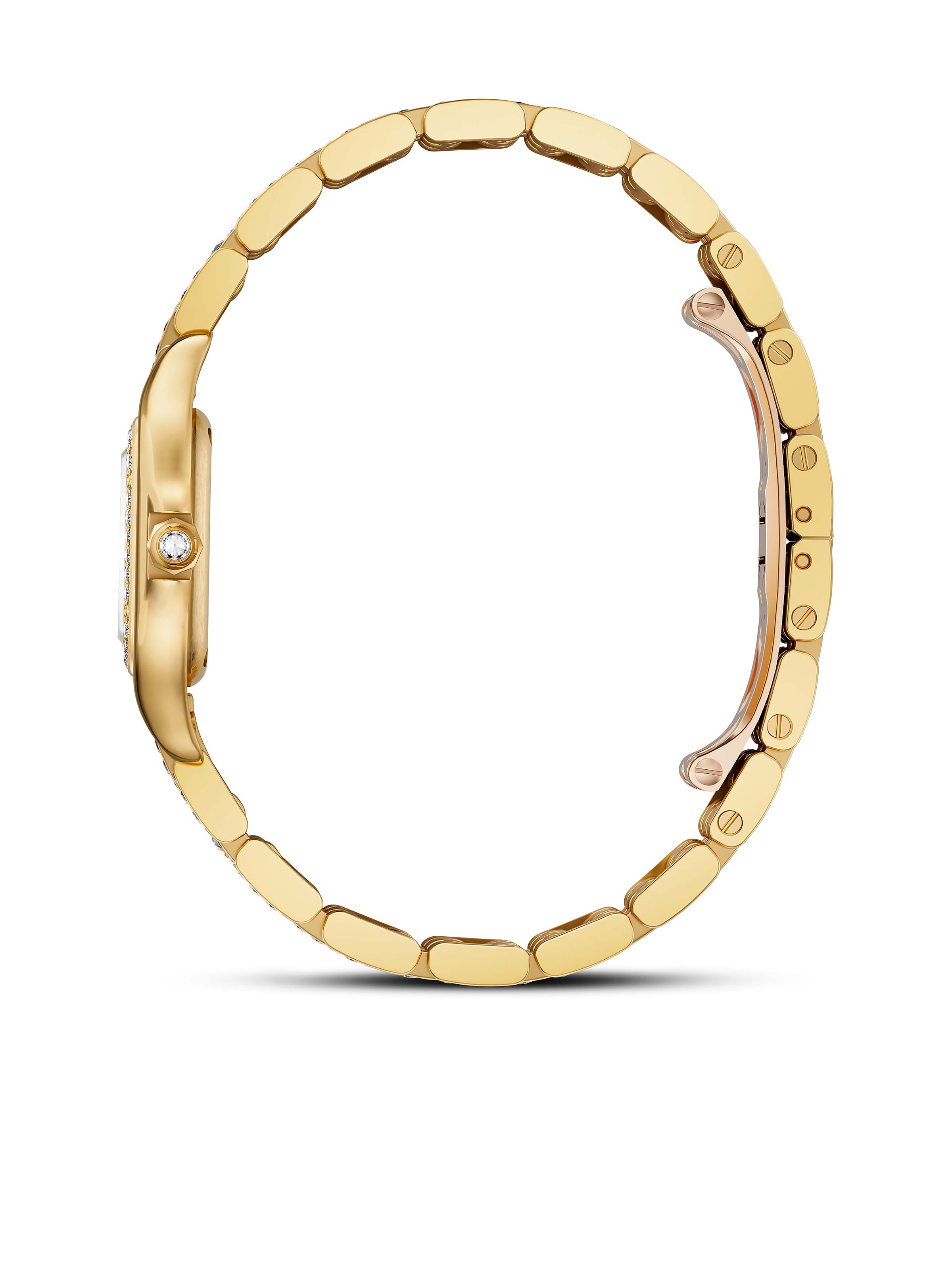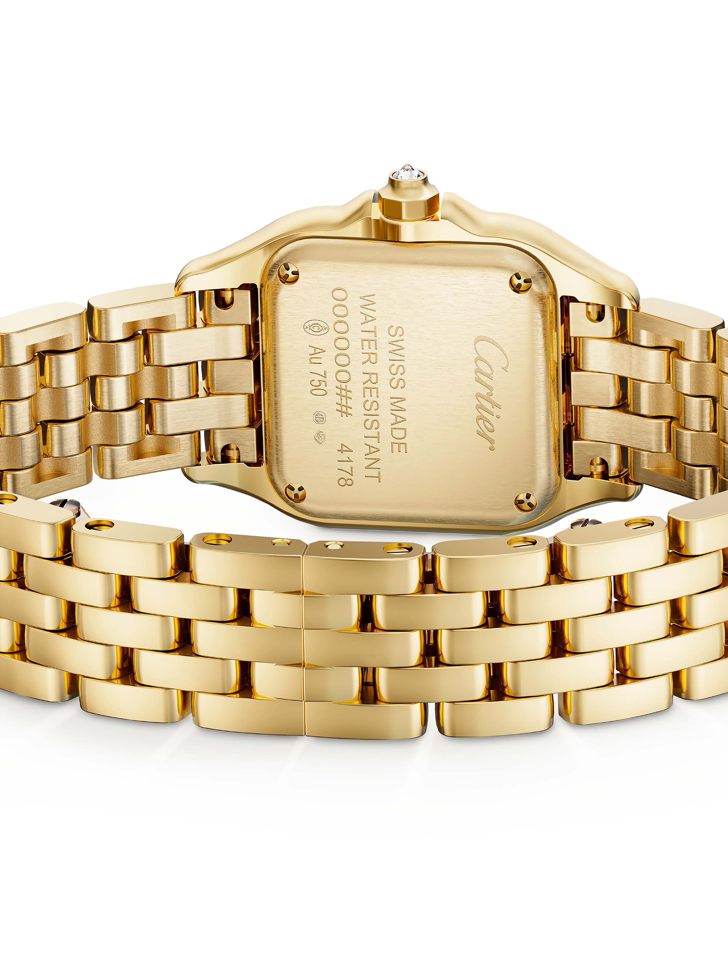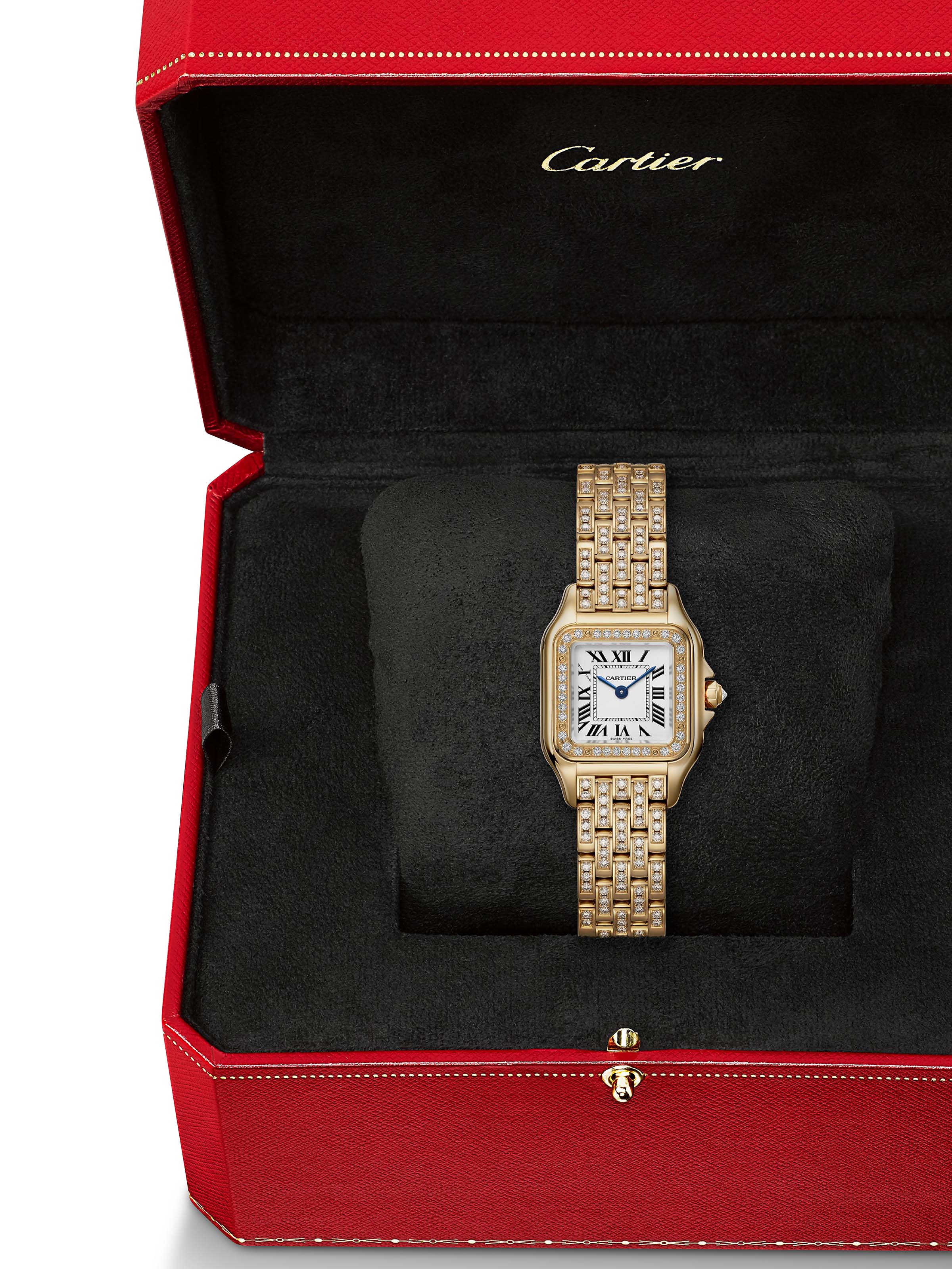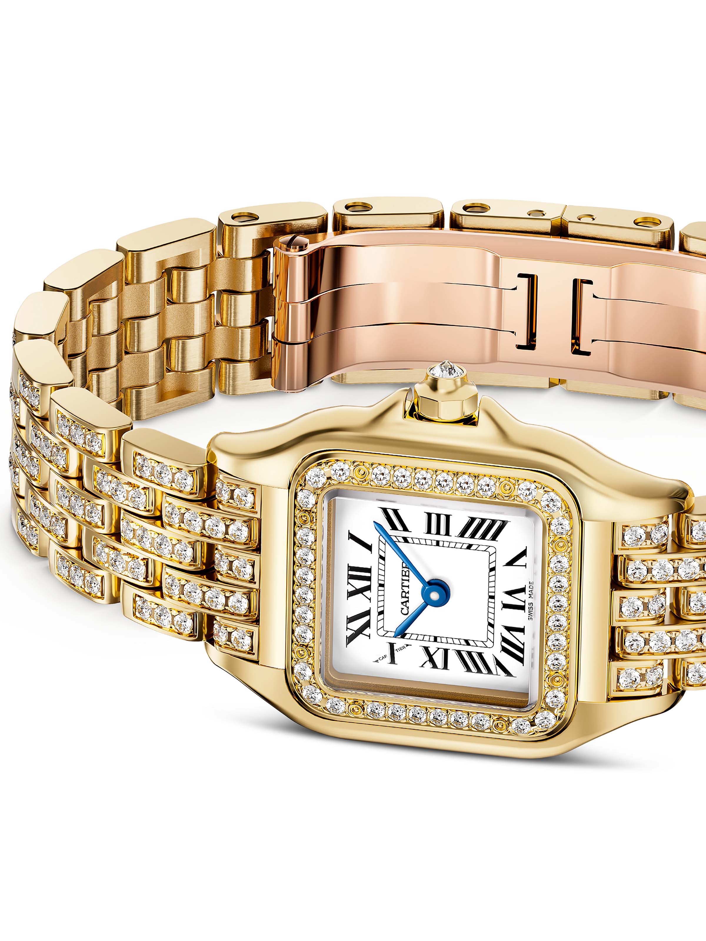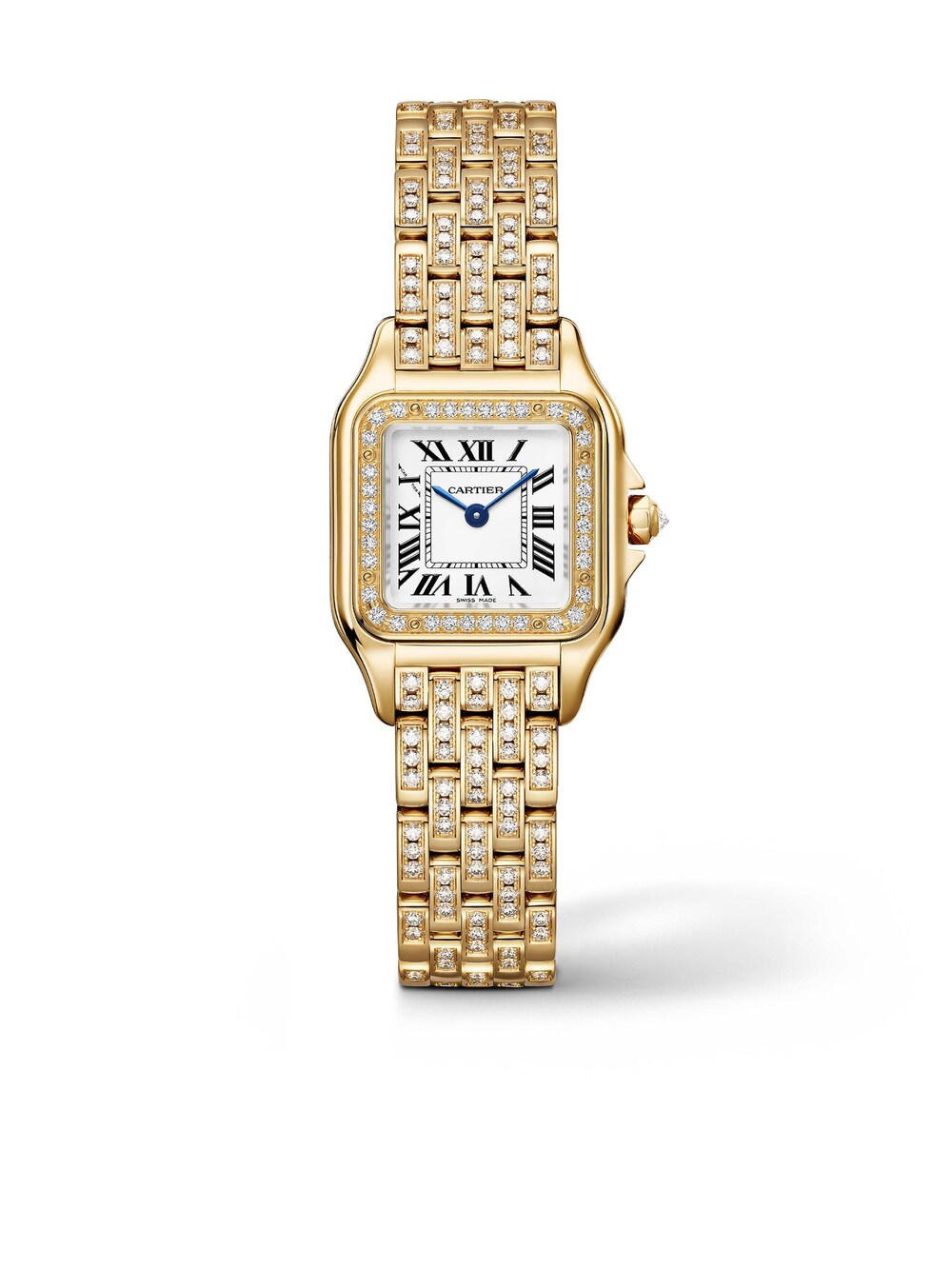 Panthère de Cartier watch, small model, quartz movement. 18K yellow gold (750/1000) case set with 36 brilliant-cut diamonds totaling 0.25 carats. Dimensions: 30.3 mm x 22 mm, thickness: 6.05 mm. 18K yellow gold (750/1000) octagonal crown set with a brilliant-cut diamond totaling 0.02 carats. Silvered dial, blued-steel sword-shaped hands. 18K yellow gold (750/1000) bracelet, semi-set with 142 brilliant-cut diamonds totaling 1.29 carats. Water-resistant up to 3 bar (approx. 30 meters/100 feet).