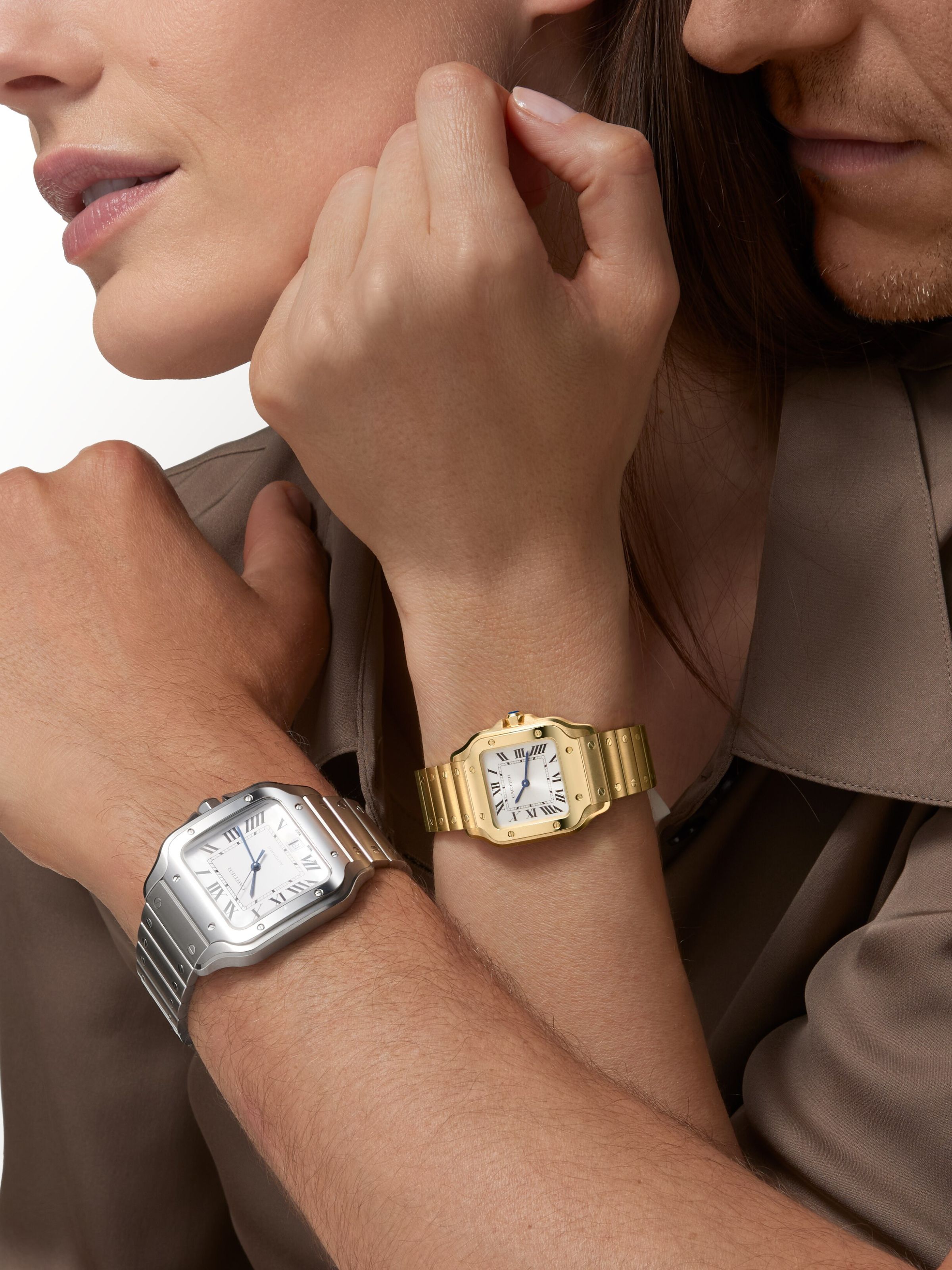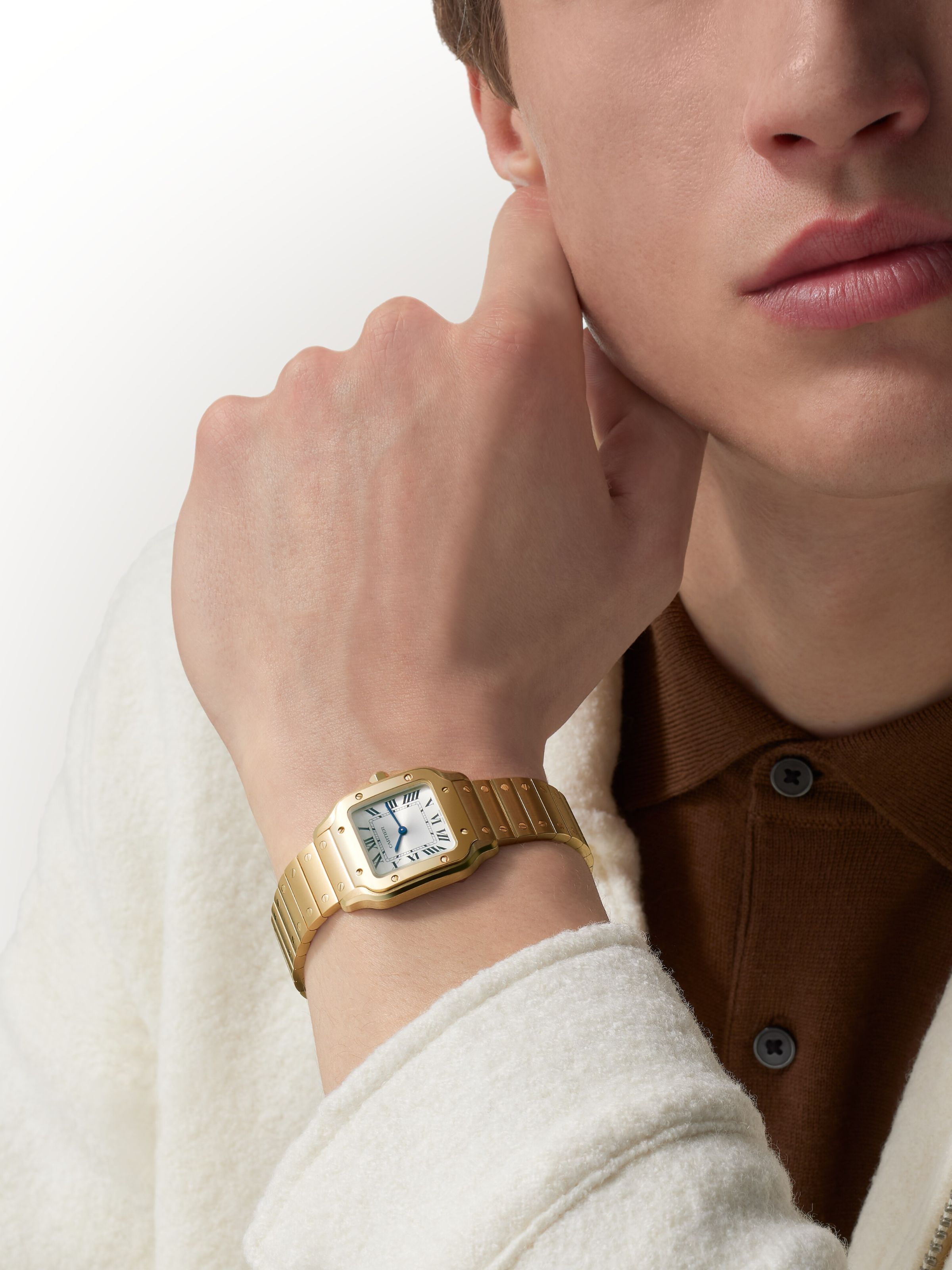 The Cartier Santos WGSA0107 is a testament to timeless elegance and innovation, seamlessly blending tradition with modern flair. This unisex masterpiece, a highlight of the latest trade show, captivates at first glance with its exquisite 18k yellow gold case and bracelet, radiating luxury and sophistication. Its silver dial, adorned with classic Roman numerals and a central seconds hand, offers a glimpse into Cartier's commitment to both aesthetic beauty and functionality. Powered by a quartz movement, this watch is a marvel of precision, ensuring reliability and ease of use. The sapphire crystal glass and a water resistance of up to 3 bar further attest to its durability and craftsmanship. With its 18k yellow gold bezel and stainless steel case back, the Santos WGSA0107 is a symbol of Cartier's unparalleled watchmaking heritage, designed to adorn the wrists of those who appreciate the finer things in life.