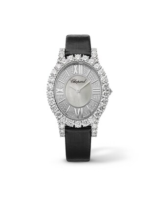 Discover the epitome of elegance with Chopard's L'Heure du Diamant, a masterpiece that embodies the essence of luxury and sophistication for the discerning woman. Crafted from the finest 18k white gold, this hand-wound marvel dazzles with a pavé dial that captures the light and the imagination. Its 40-millimeter case gracefully adorns the wrist, complemented by a chic black textile strap that adds a touch of modernity to its timeless allure. The watch is powered by the precise 10.01-C caliber, boasting a 45-hour power reserve, ensuring reliability and precision. Its sapphire crystal glass, white gold bezel, and case back further accentuate its luxurious appeal. Water-resistant to 3 bar, it combines functionality with unparalleled elegance. Roman numerals and index hour markers provide a classic touch to this exquisite timepiece. Experience the new standard of luxury with Chopard's L'Heure du Diamant, where craftsmanship meets the pinnacle of design.