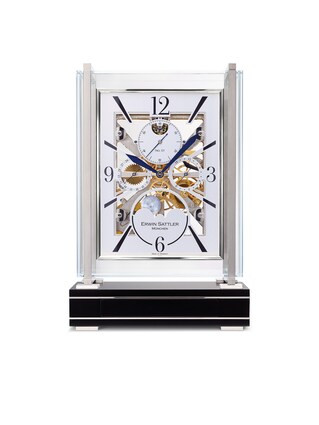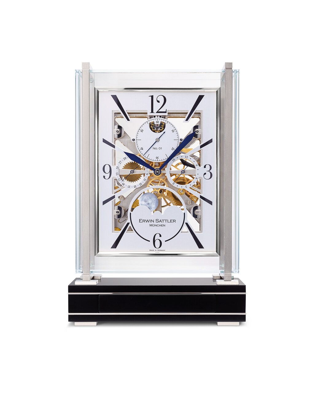 Functional perfection and impressive watchmaking art: The Erwin Sattler Opera shines with a chrome -plated case, an artfully skeleton dial, a hand-painted moon phase and date indicator, and blued steel hands. The power reserve of 15 days is also displayed on the dial. The interior of the movement can be viewed through the mineral glass panels. As a furnishing accessory, this clock makes an attractive statement in stylish interiors.