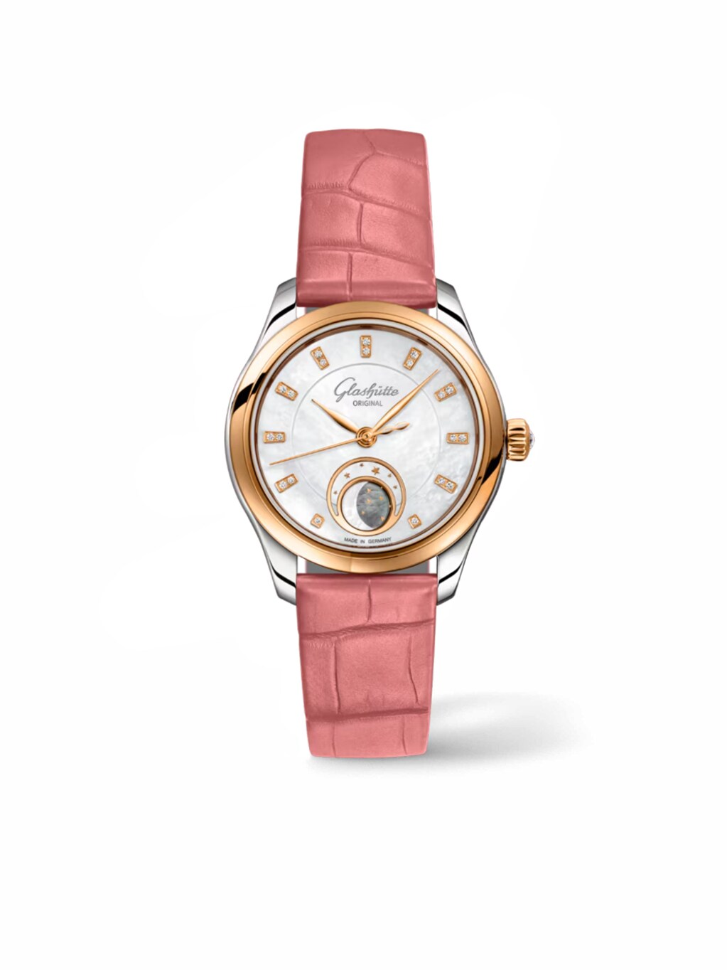 Discover the essence of nocturnal elegance with the Glashütte Original Serenade Luna, a timepiece that captures the poetic beauty of the moon's phases against a backdrop of lustrous mother-of-pearl. Crafted for women who appreciate the harmony of sophisticated design and mechanical precision, this watch is a symphony of refined details. Its 32.5 millimeter stainless steel case gracefully houses a dial adorned with diamond hour markers, which sparkle like stars in the night sky. The heart of this masterpiece is the 35-14 caliber, a self-winding manufacture movement that boasts a 60-hour power reserve, ensuring reliability and precision. The moon phase function adds a celestial touch, beautifully integrated into the dial, offering a glimpse into the lunar cycle's mystique. Encased by a rose gold bezel and protected by a sapphire crystal glass, the Serenade Luna is water-resistant up to 3 bar. An alligator-skin strap in rose complements the case, secured with a folding clasp, marrying comfort with luxury. This watch is not just a timekeeper; it's a tribute to the elegance that shines day and night.