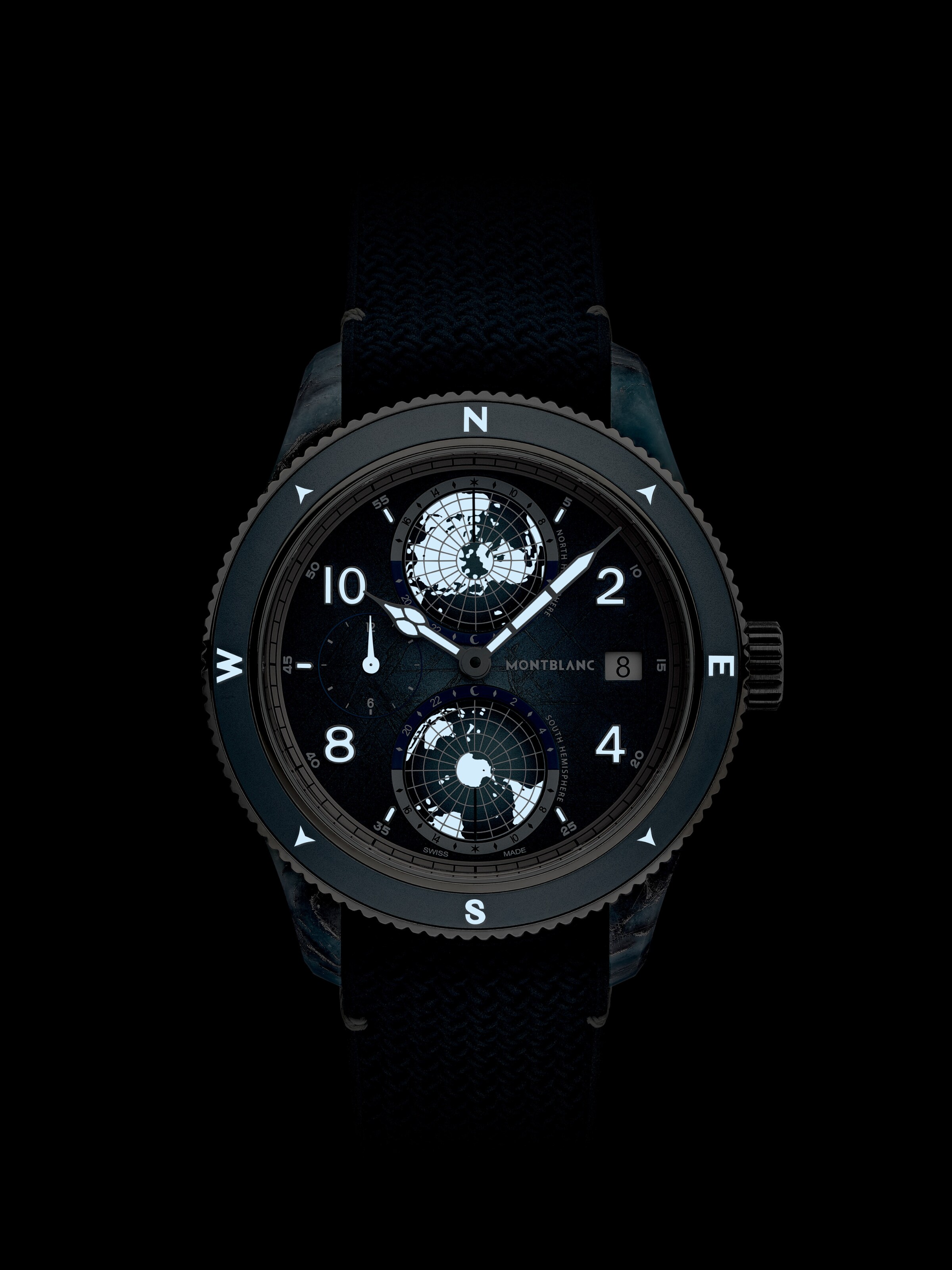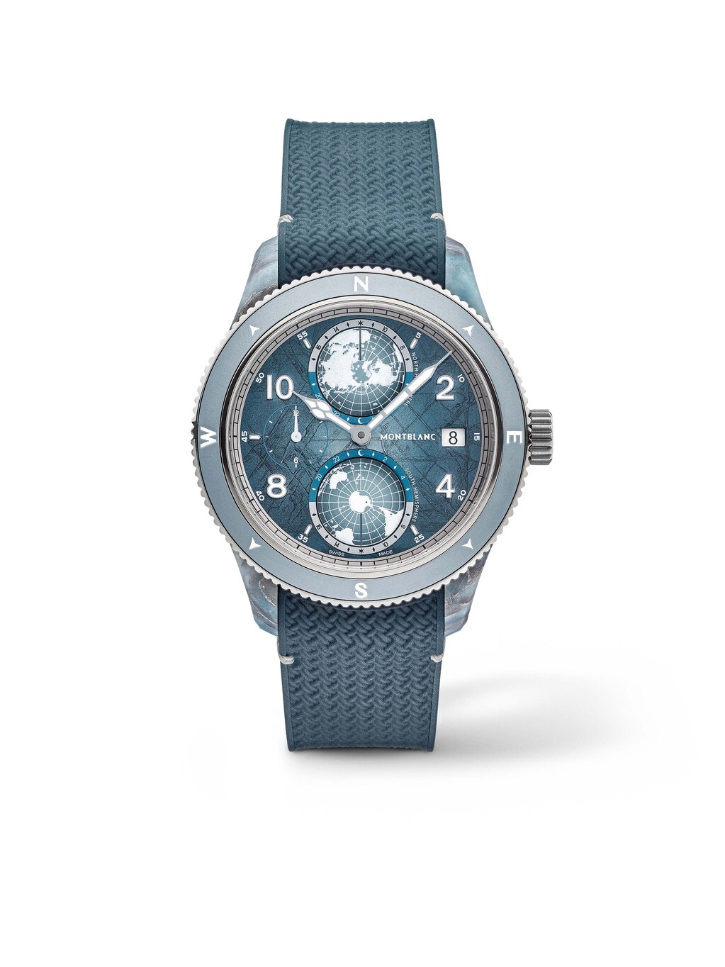 Montblanc 1858 Geosphere 0 Oxygen Mount Vinson 43.5 mm titanium and composite material with blue-green rubber strap, self-winding manufacture calibre MB29.25 with world time complication, 24-hour scale, day/night display, second time zone and date display | Reference Number MB000077