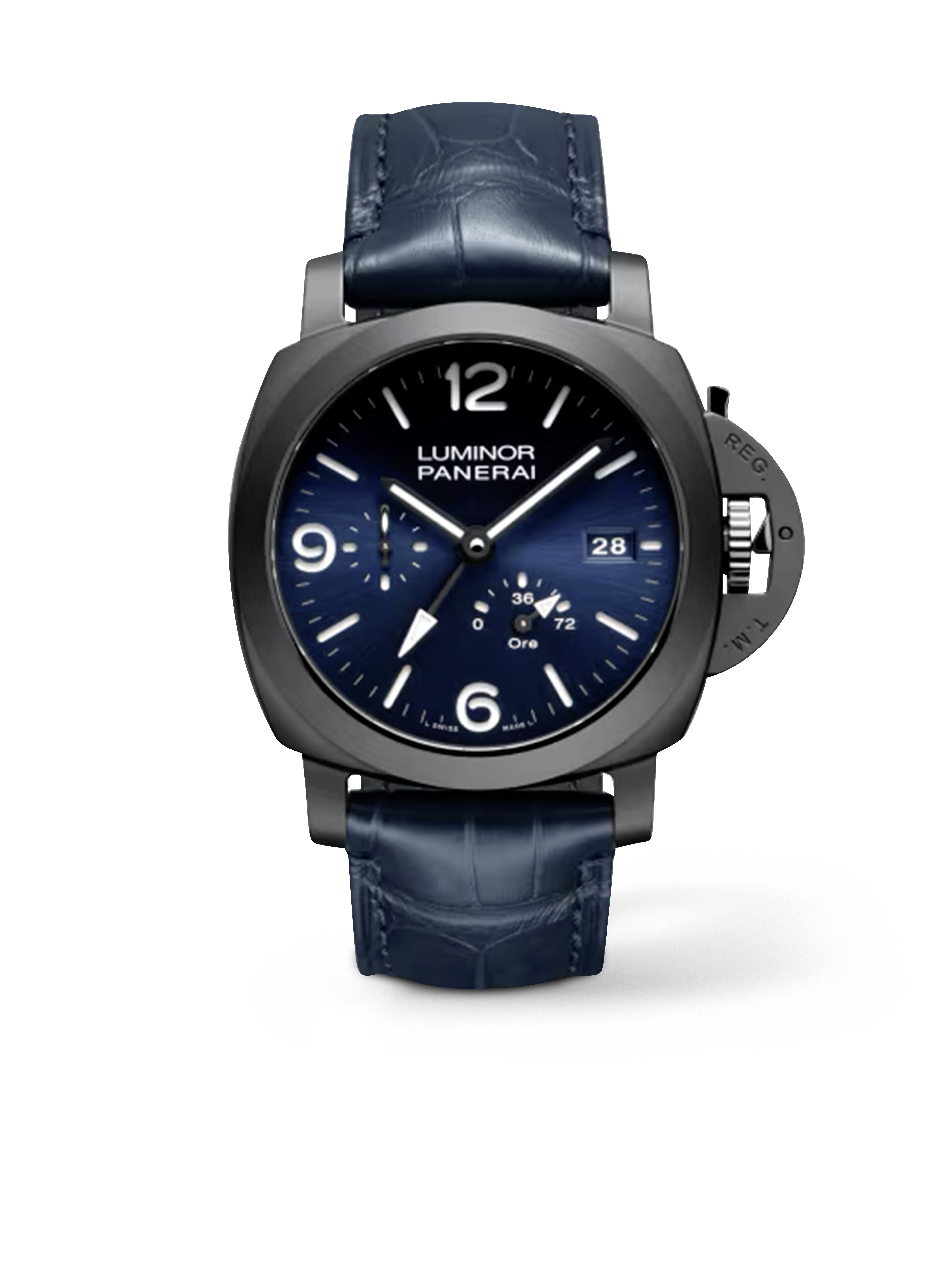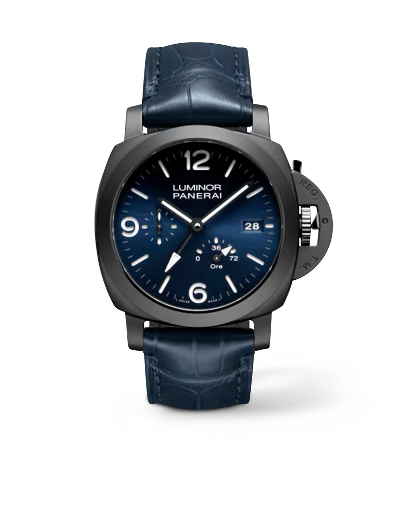 With the Panerai Luminor GMT Power Reserve Ceramica 44mm PAM01574, technical innovation meets striking design in a bold and uncompromising timepiece. Featuring a 44-millimeter black ceramic case, it embodies modern strength and a commanding presence on the wrist. The deep blue dial with Arabic numerals and hour markers creates a powerful sense of clarity, while the small seconds, date display, and second time zone highlight its functional sophistication. Driven by the automatic manufacture caliber P.9012, it delivers a 72-hour power reserve and exceptional precision in every situation. Water-resistant to 30 bar, it is a reliable companion for adventures around the globe, both above and below the surface. The blue alligator leather strap provides an elegant contrast to the ceramic case, completing the distinctive character of this extraordinary timepiece that unites Italian design with Swiss watchmaking expertise at the highest level.