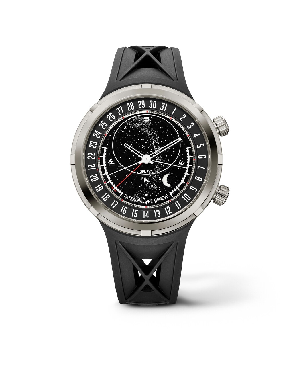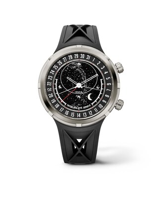 The spectacular Patek Philippe Ref. 6105G-001 “Celestial” is an impressive mechanical representation of the universe. As part of the Grand Complications collection, this model combines the highest level of watchmaking artistry with astronomical precision. The intricately designed dial displays the starry sky above Geneva, the phases of the moon, and, for the first time, the exact times of sunrise and sunset—calibrated to a real geographical location (Geneva’s latitude). A corrector button allows to adjust the indications to summer and winter time. The 47-millimeter case in 18k white gold underscores the watch’s futuristic design, as does the exceptional composite strap, while the ultra-thin caliber 240 C LU CL LCSO with micro-rotor holds six patents and combines complex functions within a very compact space.