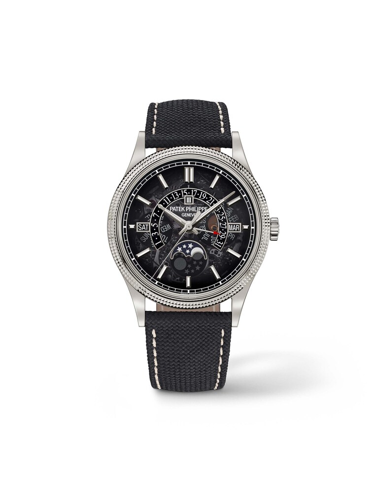 Grand Complications - 6159G 39.5 mm, 18k white gold with black bracelet made of composite material, self-winding manufacture calibre 26-330 S QR with perpetual calendar, retrograde date indicator, day of the week, month, leap year cycle and moon-phase display | Reference Number PP330198