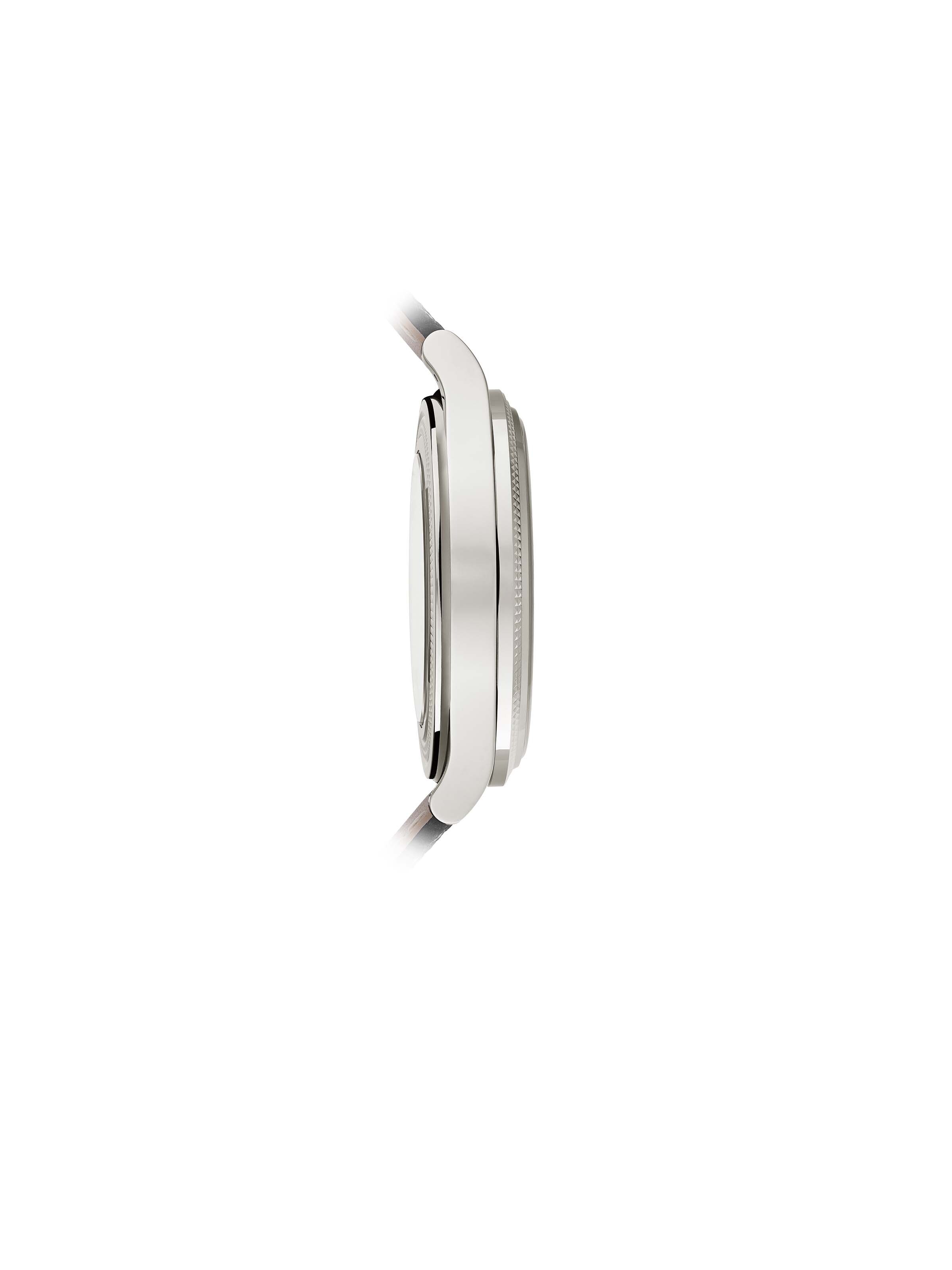 The Patek Philippe Ref. 6159G-001 embodies the quintessence of the finest watchmaking artistry and reinterprets the perpetual calendar with a reset date pointer in an original way. The dial made of sapphire crystal with gray metallization and black gradient allows glimpses of the highly precise mechanical caliber 26-330 S QR automatic winding mechanism. On the dial, luminescent coated baton indices and hands ensure good readability of the time. The displays for the day of the week, month, leap year cycle, moon phase and center seconds hand are optimally integrated into the dial. The bezel and case back of the 18K white gold case, which has a water resistance of up to three bar, are adorned with the characteristic Clou de Paris guilloché pattern. With a diameter of 39.5 millimeters, the sporty and elegant timepiece sits perfectly on the wrist. The black textile strap with a patented three-leaf white gold folding clasp completes the profile of this watch, which is not just a wristwatch, but a statement for the sophisticated man.