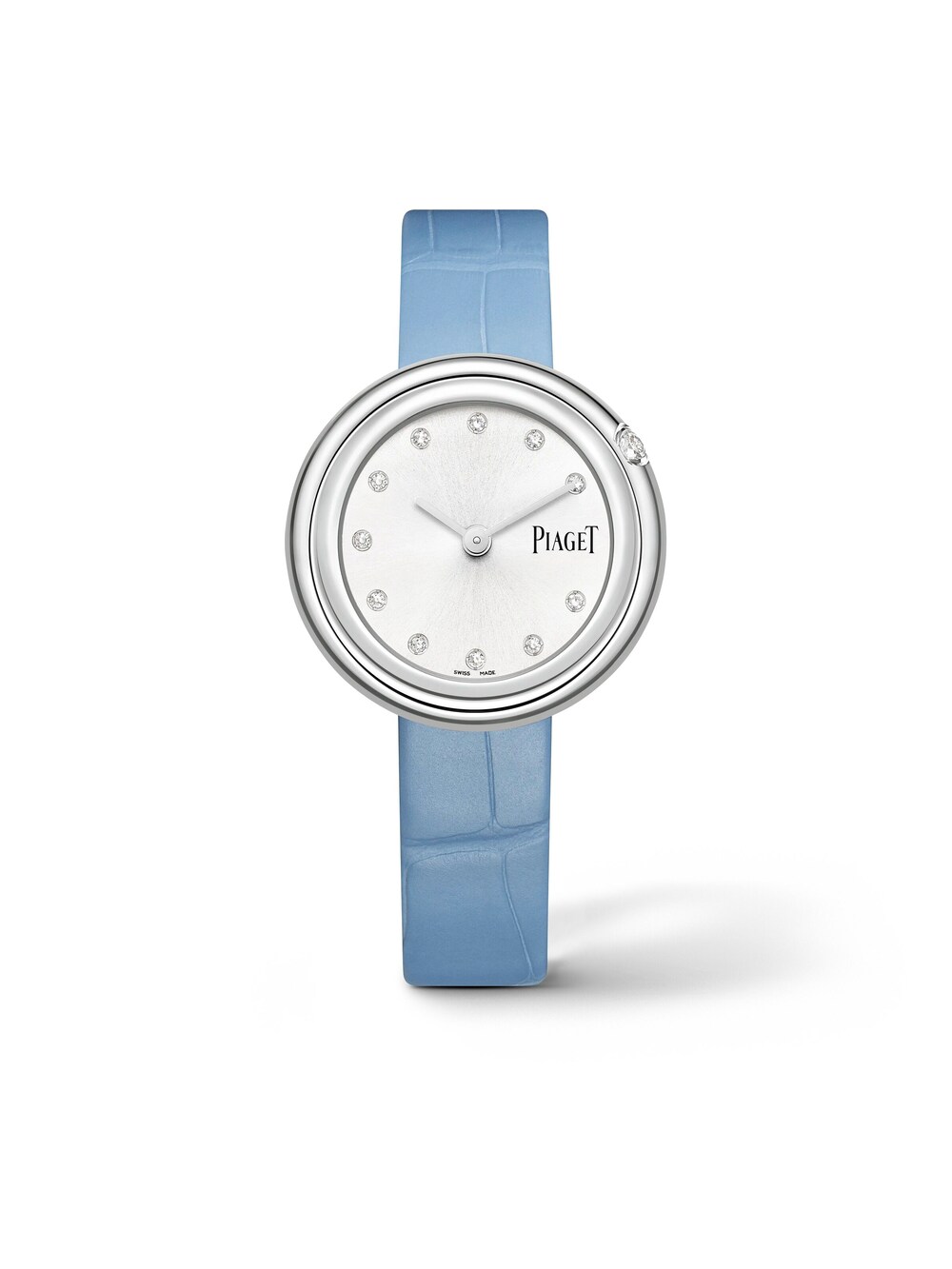 Timeless elegance in a modern interpretation is embodied by the Piaget Possession G0A47080 ladies’ watch. The 29 mm stainless steel case is enhanced by a single sparkling brilliant-cut diamond (approx. 0.05 ct). On the dial, 11 diamonds (approx. 0.07 ct) create radiant accents and highlight the feminine refinement of the design. Worn on an interchangeable light blue alligator leather strap, this quartz timepiece featuring the Piaget 358P manufacture movement combines luxurious lightness with the iconic Possession aesthetic.